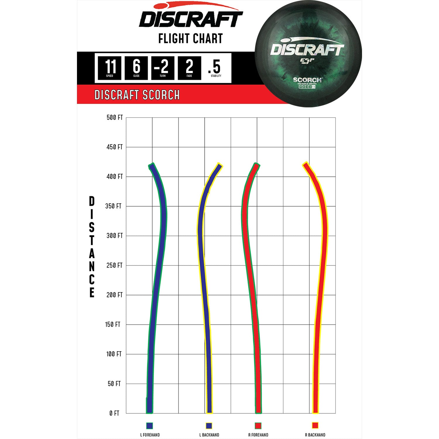 Designed to provide maximum glide with a reliable fade regardless of your skill level. Beginner to Intermediate players will find the Scorch an easy to throw straight flier that will fight to come back, even in the wind, while Advanced and Professionals can expect high-speed turn and a late finish producing amazing distance.