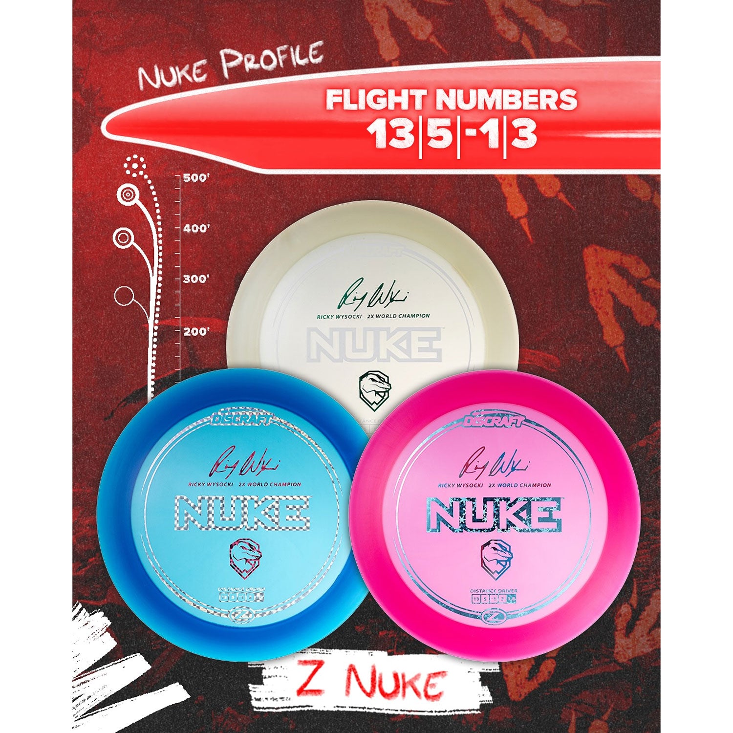 To honor Ricky Wysocki’s legacy as a two-time PDGA World Champion, Discraft proudly adds the Z Nuke to Ricky Wysocki’s signature series discs. One of the most popular high-speed drivers in the game, the Nuke offers massive glide, a wide rim, and straight-to-overstable flight at high power. Perfect for long bombs and confident finishes, this Z blend Nuke delivers consistent flight with the Wysocki seal of approval.