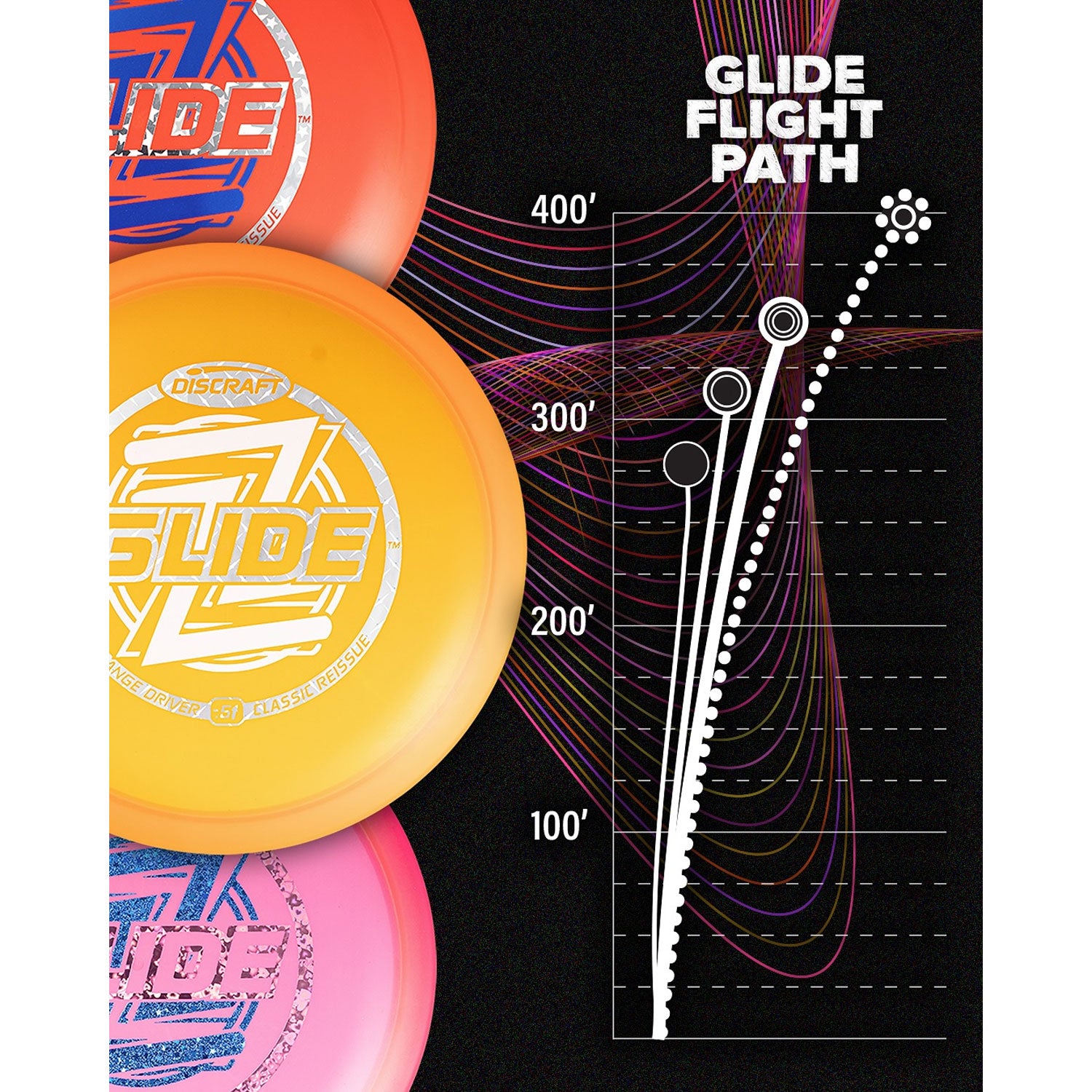 The Glide returns in a Classic Reissue Z plastic, bringing back one of Discraft’s most effortless distance drivers. Known for its understable flight, the Glide offers smooth turnovers, long hyzer-flips, and controllable distance with minimal effort. Its generous glide rating makes it a favorite for newer players looking for extra distance, while experienced players can use it for shaping creative lines through the fairway.