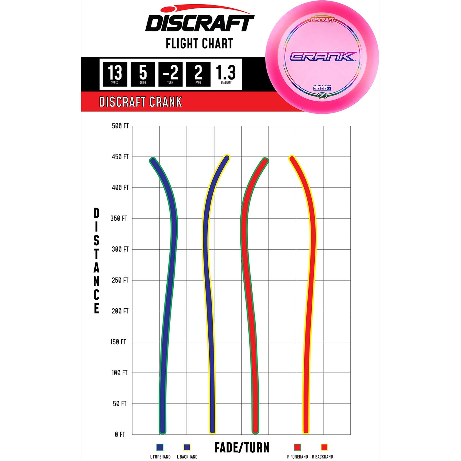 The Crank is a high speed driver with a balanced turn and fade that can reach huge distances. Useful for players of all skill levels for lower arm speed flex shots or long turning shots when thrown with power.