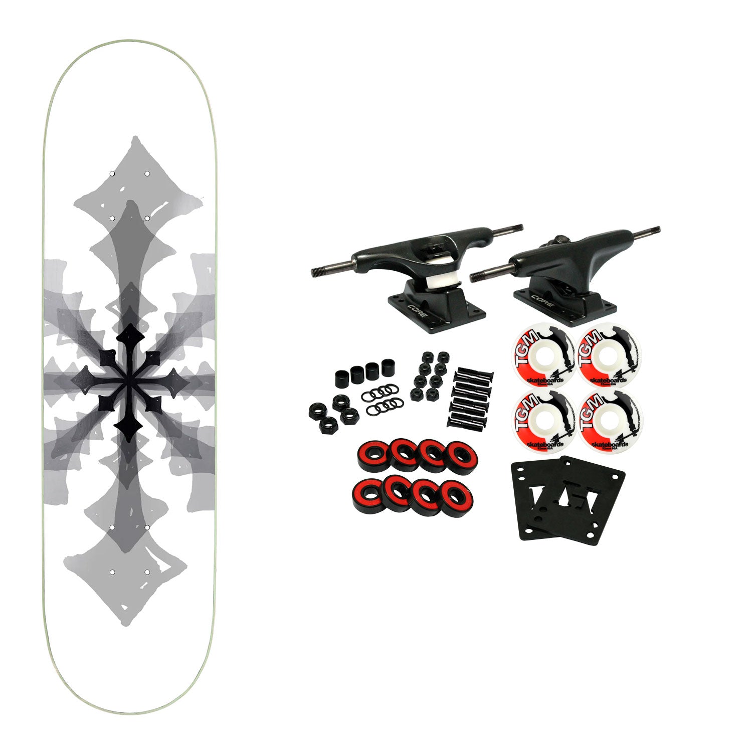 Disorder decks are constructed with Premium 7-Ply North American Maple. This board measures 8.0" x 31.75" with a 14.18" wheelbase. Comes with Core trucks, 52mm TGM logo wheels, Amp abec 5 bearings, Black Diamond Griptape, risers, and hardware. Core trucks are light weight and feature heavy duty aluminum with grade 8 steel kingpins and axles, as well as USA made bushings and pivot cups. 52mm 99A are the perfect wheels for both street and park skating. Like the name states, Amp bearings are stimulants for your wheels! Light synthetic oil, Delrin Crowns, and Rubber Serviceable Shields are a few of the things that makes these bearings one of the best Abec 5 rated bearings on the market. Arrives un-assembled which allows for customization and a feeling of accomplishment. Skaters love building their boards! Easy to assemble!
