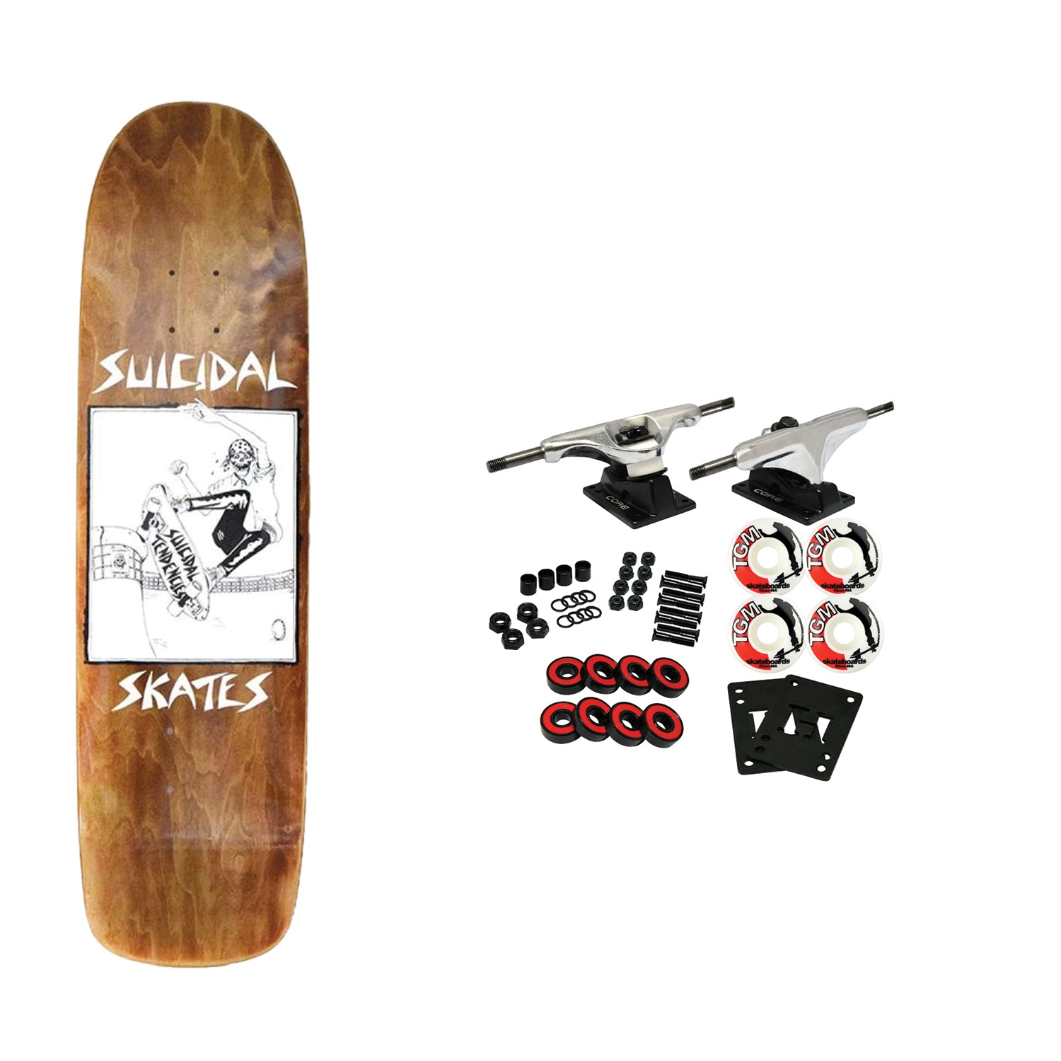 Suicidal Skates Pool Skater Skateboard Deck. Art by Lance Mountain. Measures 8.5" x 32.075" with a 14.5" wheelbase. Comes with Core trucks, 52mm TGM logo wheels, Amp abec 5 bearings, Black Diamond Griptape, risers, and hardware. Core trucks are light weight and feature heavy duty aluminum with grade 8 steel kingpins and axles, as well as USA made bushings and pivot cups. 52mm 99A are the perfect wheels for both street and park skating. Like the name states, Amp bearings are stimulants for your wheels! Light synthetic oil, Delrin Crowns, and Rubber Serviceable Shields are a few of the things that makes these bearings one of the best Abec 5 rated bearings on the market. Arrives un-assembled which allows for customization and a feeling of accomplishment. Skaters love building their boards! Easy to assemble!
