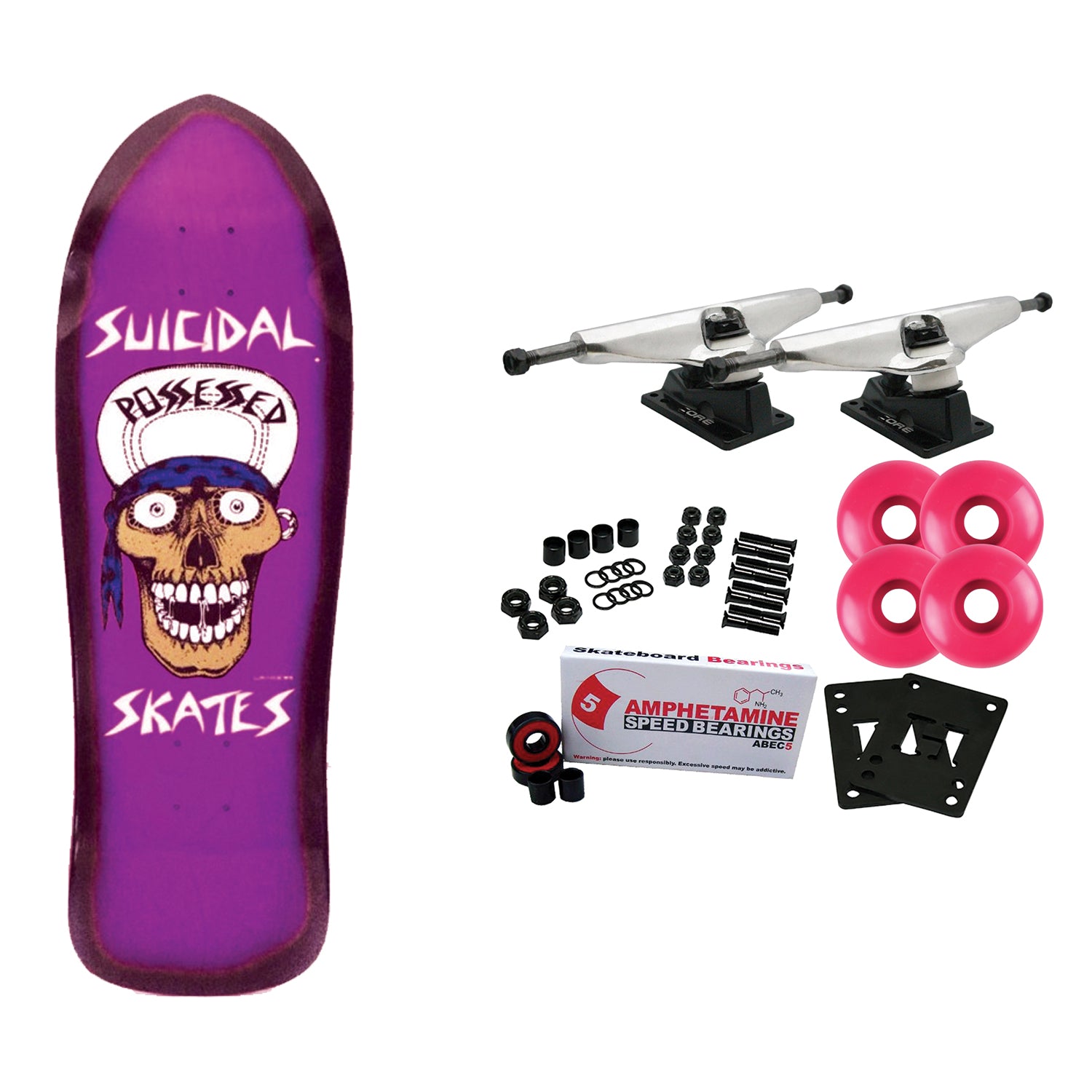 Suicidal Skates Punk Skull Reissue, Made at PS Stix. Measures 10.125" x 30.825" with a 15" wheelbase. Comes with Core trucks, 58mm 97A wheels, Amp abec 5 bearings, Black Diamond Griptape, risers, and hardware. Core trucks are light weight and feature heavy duty aluminum with grade 8 steel kingpins and axles, as well as USA made bushings and pivot cups. 58mm 97A are the perfect wheels for both street and park skating. Like the name states, Amp bearings are stimulants for your wheels! Light synthetic oil, Delrin Crowns, and Rubber Serviceable Shields are a few of the things that makes these bearings one of the best Abec 5 rated bearings on the market. Arrives un-assembled which allows for customization and a feeling of accomplishment. Skaters love building their boards! Easy to assemble!