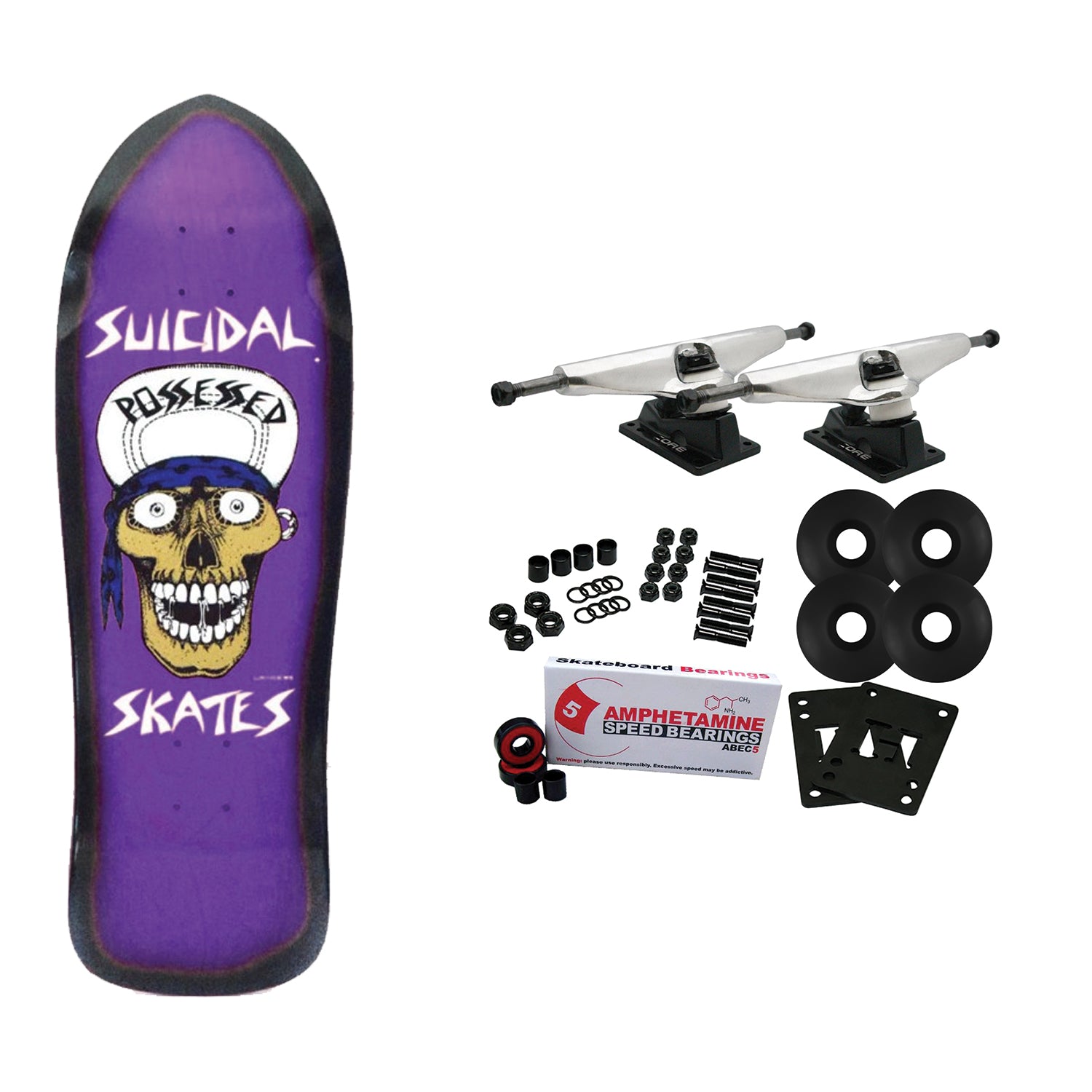 Suicidal Skates Punk Skull Reissue, Made at PS Stix. Measures 10.125" x 30.825" with a 15" wheelbase. Comes with Core trucks, 58mm 97A wheels, Amp abec 5 bearings, Black Diamond Griptape, risers, and hardware. Core trucks are light weight and feature heavy duty aluminum with grade 8 steel kingpins and axles, as well as USA made bushings and pivot cups. 58mm 97A are the perfect wheels for both street and park skating. Like the name states, Amp bearings are stimulants for your wheels! Light synthetic oil, Delrin Crowns, and Rubber Serviceable Shields are a few of the things that makes these bearings one of the best Abec 5 rated bearings on the market. Arrives un-assembled which allows for customization and a feeling of accomplishment. Skaters love building their boards! Easy to assemble!