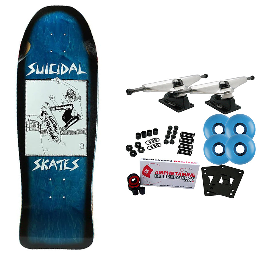 Suicidal Skates Pool Skater Reissue Deck. Art by Lance Mountain. Made at PS Stix. Measures 10.125" x 30.325" with a 15.5" wheelbase. Comes with Core trucks, 58mm 97A wheels, Amp abec 5 bearings, Black Diamond Griptape, risers, and hardware. Core trucks are light weight and feature heavy duty aluminum with grade 8 steel kingpins and axles, as well as USA made bushings and pivot cups. 58mm 97A are the perfect wheels for both street and park skating. Like the name states, Amp bearings are stimulants for your wheels! Light synthetic oil, Delrin Crowns, and Rubber Serviceable Shields are a few of the things that makes these bearings one of the best Abec 5 rated bearings on the market. Arrives un-assembled which allows for customization and a feeling of accomplishment. Skaters love building their boards! Easy to assemble!