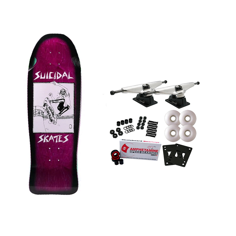 Suicidal Skates Pool Skater Reissue Deck. Art by Lance Mountain. Made at PS Stix. Comes with Core trucks, 58mm 97A wheels, Amp abec 5 bearings, Black Diamond Griptape, risers, and hardware. Core trucks are light weight and feature heavy duty aluminum with grade 8 steel kingpins and axles, as well as USA made bushings and pivot cups. 58mm 97A are the perfect wheels for both street and park skating. Like the name states, Amp bearings are stimulants for your wheels! Light synthetic oil, Delrin Crowns, and Rubber Serviceable Shields are a few of the things that makes these bearings one of the best Abec 5 rated bearings on the market. Arrives un-assembled which allows for customization and a feeling of accomplishment. Skaters love building their boards! Easy to assemble!