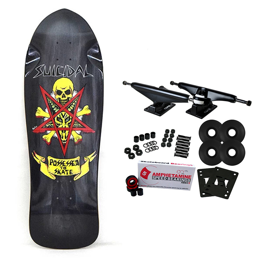 Suicidal Skates Possessed to Skate Reissue. Made at PS Stix. Measures 10.125" x 30.825" with a 15" wheelbase. Comes with Core trucks, 58mm 97A wheels, Amp abec 5 bearings, Black Diamond Griptape, risers, and hardware. Core trucks are light weight and feature heavy duty aluminum with grade 8 steel kingpins and axles, as well as USA made bushings and pivot cups. 58mm 97A are the perfect wheels for both street and park skating. Like the name states, Amp bearings are stimulants for your wheels! Light synthetic oil, Delrin Crowns, and Rubber Serviceable Shields are a few of the things that makes these bearings one of the best Abec 5 rated bearings on the market. Arrives un-assembled which allows for customization and a feeling of accomplishment. Skaters love building their boards! Easy to assemble!