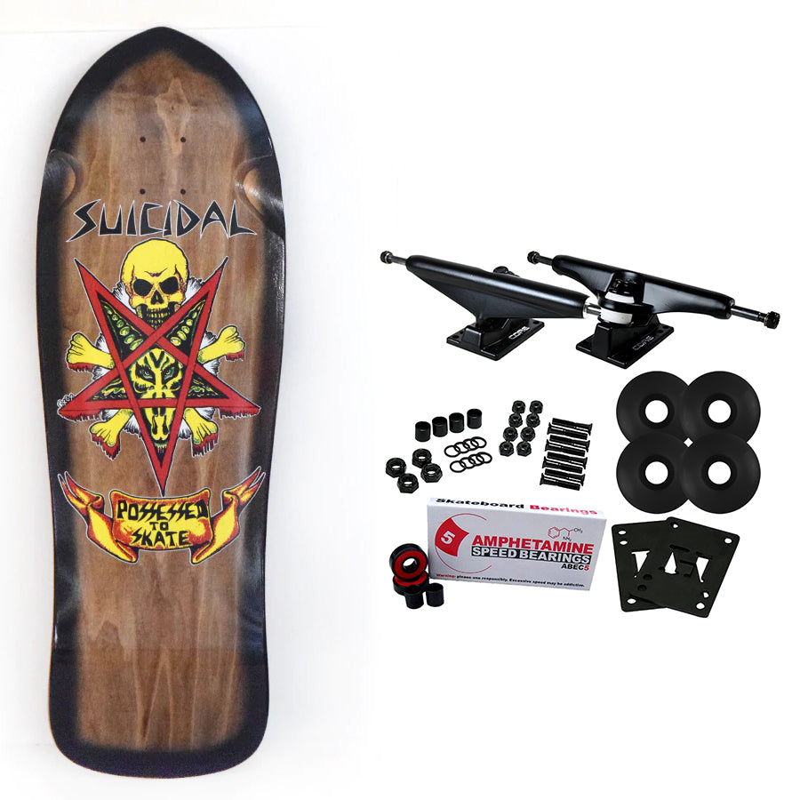 Suicidal Skates Possessed to Skate Reissue. Made at PS Stix. Measures 10.125" x 30.825" with a 15" wheelbase. Comes with Core trucks, 58mm 97A wheels, Amp abec 5 bearings, Black Diamond Griptape, risers, and hardware. Core trucks are light weight and feature heavy duty aluminum with grade 8 steel kingpins and axles, as well as USA made bushings and pivot cups. 58mm 97A are the perfect wheels for both street and park skating. Like the name states, Amp bearings are stimulants for your wheels! Light synthetic oil, Delrin Crowns, and Rubber Serviceable Shields are a few of the things that makes these bearings one of the best Abec 5 rated bearings on the market. Arrives un-assembled which allows for customization and a feeling of accomplishment. Skaters love building their boards! Easy to assemble!