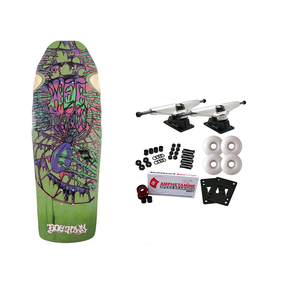 The Web was an instrumental board design in the early development of Dogtown team riders and grass root skateboarding of the mid 1980's. We added the Webs as an element to give you extra grip on the rails, especially for Aaron Murray who is missing 2 fingers on his right hand. Made at PS Stix. Comes with Core trucks, 58mm 97A wheels, Amp abec 5 bearings, Black Diamond Griptape, risers, and hardware. Core trucks are light weight and feature heavy duty aluminum with grade 8 steel kingpins and axles, as well as USA made bushings and pivot cups. 58mm 97A are the perfect wheels for both street and park skating. Like the name states, Amp bearings are stimulants for your wheels! Light synthetic oil, Delrin Crowns, and Rubber Serviceable Shields are a few of the things that makes these bearings one of the best Abec 5 rated bearings on the market. Arrives un-assembled which allows for customization and a feeling of accomplishment. Skaters love building their boards! Easy to assemble!