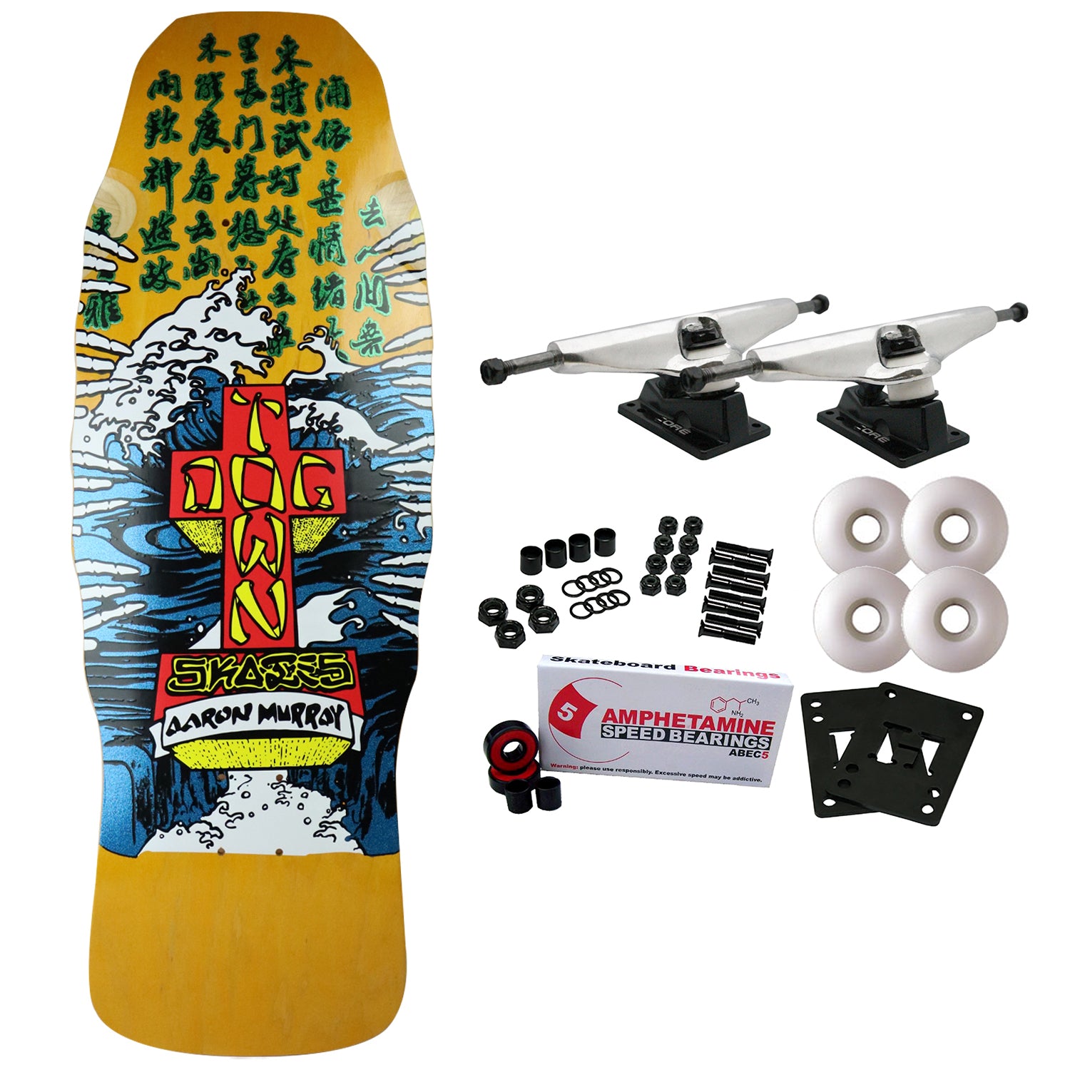 Dogtown Aaron Murray ReIssue Deck. Deck features front wheel wells. Art by Kevin Ancell. Made by PS Stix. Measures 10.5" x 31" with a 15.5" wheelbase. Comes with Core trucks, 58mm 97A wheels, Amp abec 5 bearings, Black Diamond Griptape, risers, and hardware. Core trucks are light weight and feature heavy duty aluminum with grade 8 steel kingpins and axles, as well as USA made bushings and pivot cups. 58mm 97A are the perfect wheels for both street and park skating. Like the name states, Amp bearings are stimulants for your wheels! Light synthetic oil, Delrin Crowns, and Rubber Serviceable Shields are a few of the things that makes these bearings one of the best Abec 5 rated bearings on the market. Arrives un-assembled which allows for customization and a feeling of accomplishment. Skaters love building their boards! Easy to assemble!