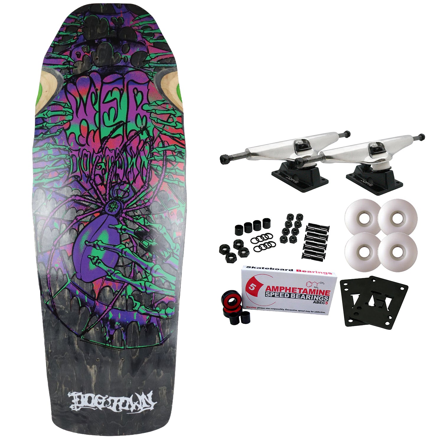 7-Ply North American Maple. The Web was an instrumental board design in the early development of Dogtown team riders and grass root skateboarding of the mid 1980's. Made by PS Stix. Measures 10.25" x 30.7" with a 15.5" wheelbase. Comes with Core trucks, 58mm 97A wheels, Amp abec 5 bearings, Black Diamond Griptape, risers, and hardware. Core trucks are light weight and feature heavy duty aluminum with grade 8 steel kingpins and axles, as well as USA made bushings and pivot cups. 58mm 97A are the perfect wheels for both street and park skating. Like the name states, Amp bearings are stimulants for your wheels! Light synthetic oil, Delrin Crowns, and Rubber Serviceable Shields are a few of the things that makes these bearings one of the best Abec 5 rated bearings on the market. Arrives un-assembled which allows for customization and a feeling of accomplishment. Skaters love building their boards! Easy to assemble!