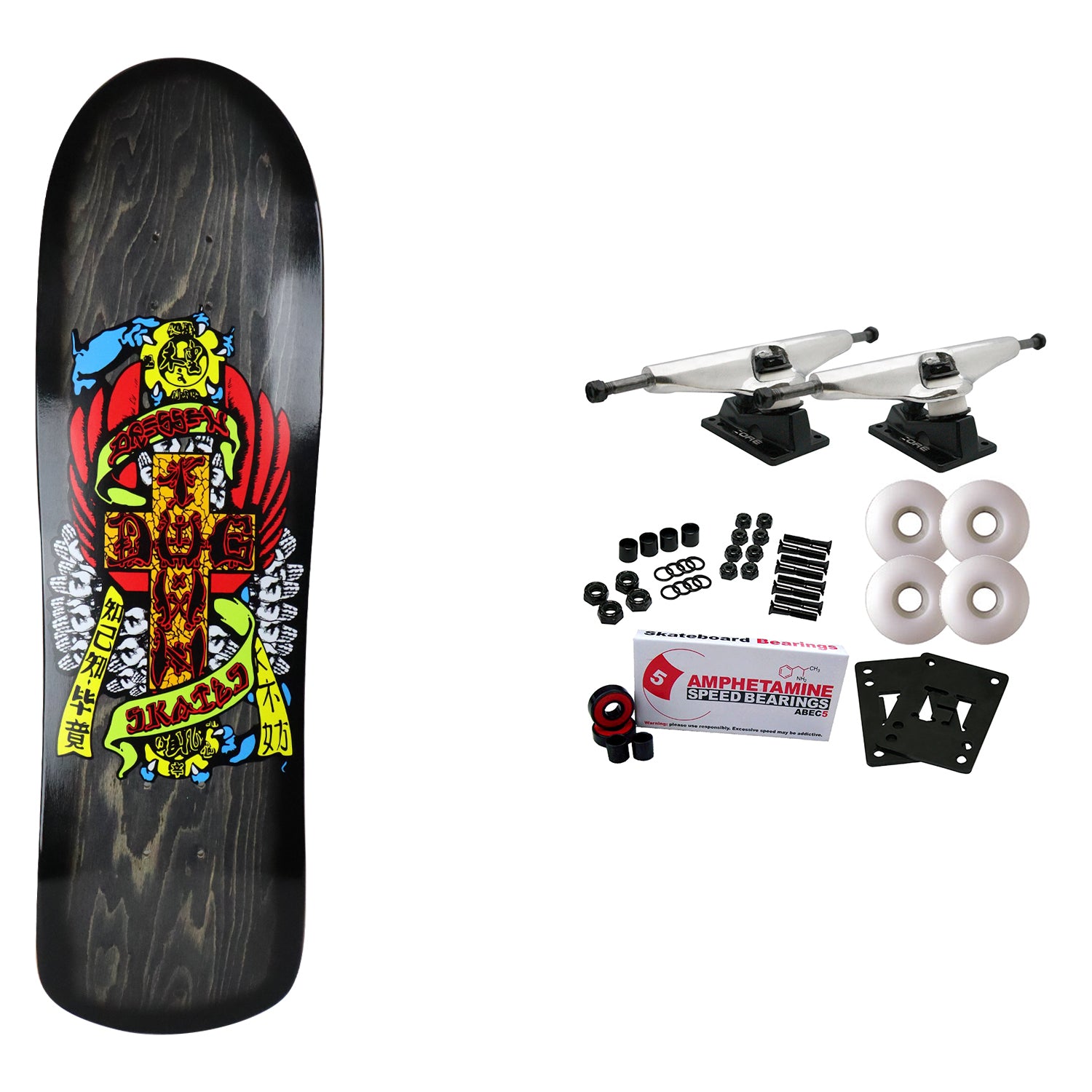 The Dogtown Eric Dressen Hands M80 deck is a modern version of the classic 80's deck. Made at PS Stix. Measures 8.75" x 32" with a 14.25" wheelbase. Comes with Core trucks, 58mm 97A wheels, Amp abec 5 bearings, Black Diamond Griptape, risers, and hardware. Core trucks are light weight and feature heavy duty aluminum with grade 8 steel kingpins and axles, as well as USA made bushings and pivot cups. 58mm 97A are the perfect wheels for both street and park skating. Like the name states, Amp bearings are stimulants for your wheels! Light synthetic oil, Delrin Crowns, and Rubber Serviceable Shields are a few of the things that makes these bearings one of the best Abec 5 rated bearings on the market. Arrives un-assembled which allows for customization and a feeling of accomplishment. Skaters love building their boards! Easy to assemble!