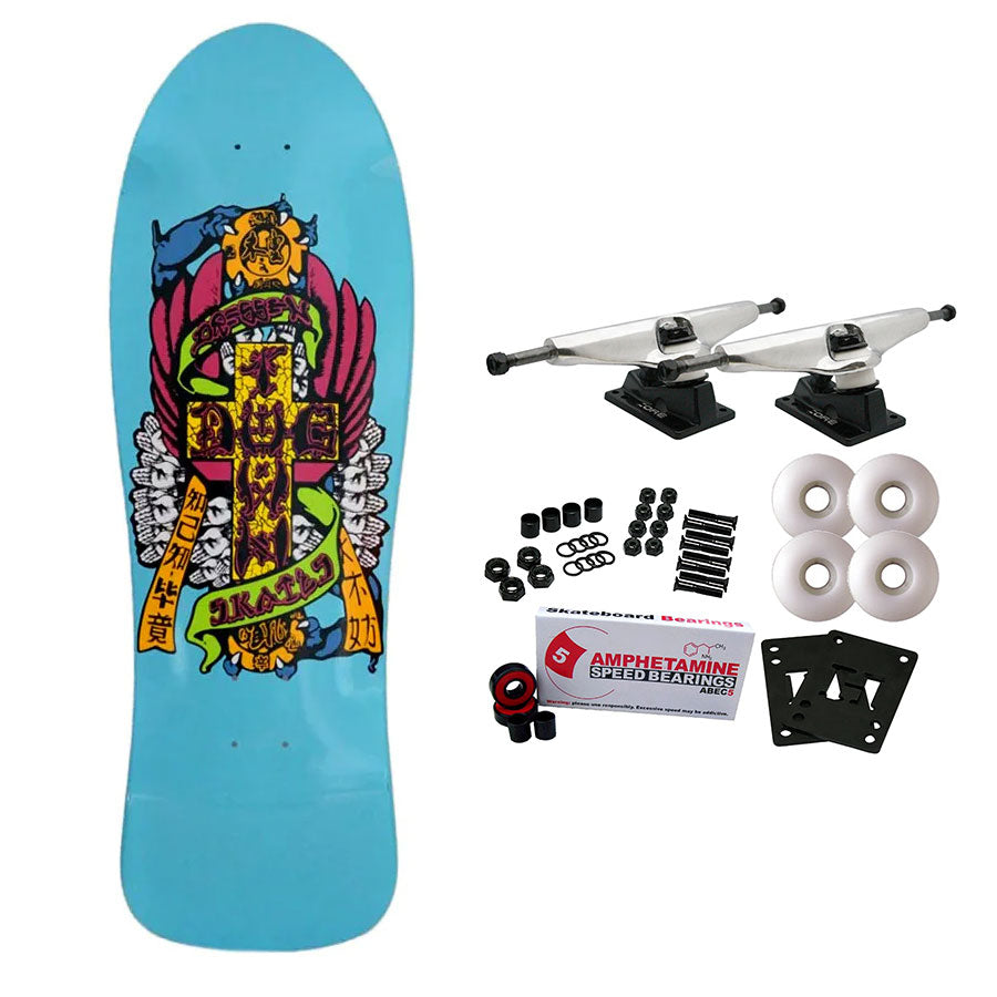 Dogtown Eric Dressen 80s Reissue Deck. Art by Kevin Ancell. Front wheel wells. Hard edge top. Made at BBS. Sky Blue Full Dip. Measures 10.125" x 30.325" with a 15.25" wheelbase. Comes with Core trucks, 58mm 97A wheels, Amp abec 5 bearings, Black Diamond Griptape, risers, and hardware. Core trucks are light weight and feature heavy duty aluminum with grade 8 steel kingpins and axles, as well as USA made bushings and pivot cups. 58mm 97A are the perfect wheels for both street and park skating. Like the name states, Amp bearings are stimulants for your wheels! Light synthetic oil, Delrin Crowns, and Rubber Serviceable Shields are a few of the things that makes these bearings one of the best Abec 5 rated bearings on the market. Arrives un-assembled which allows for customization and a feeling of accomplishment. Skaters love building their boards! Easy to assemble!