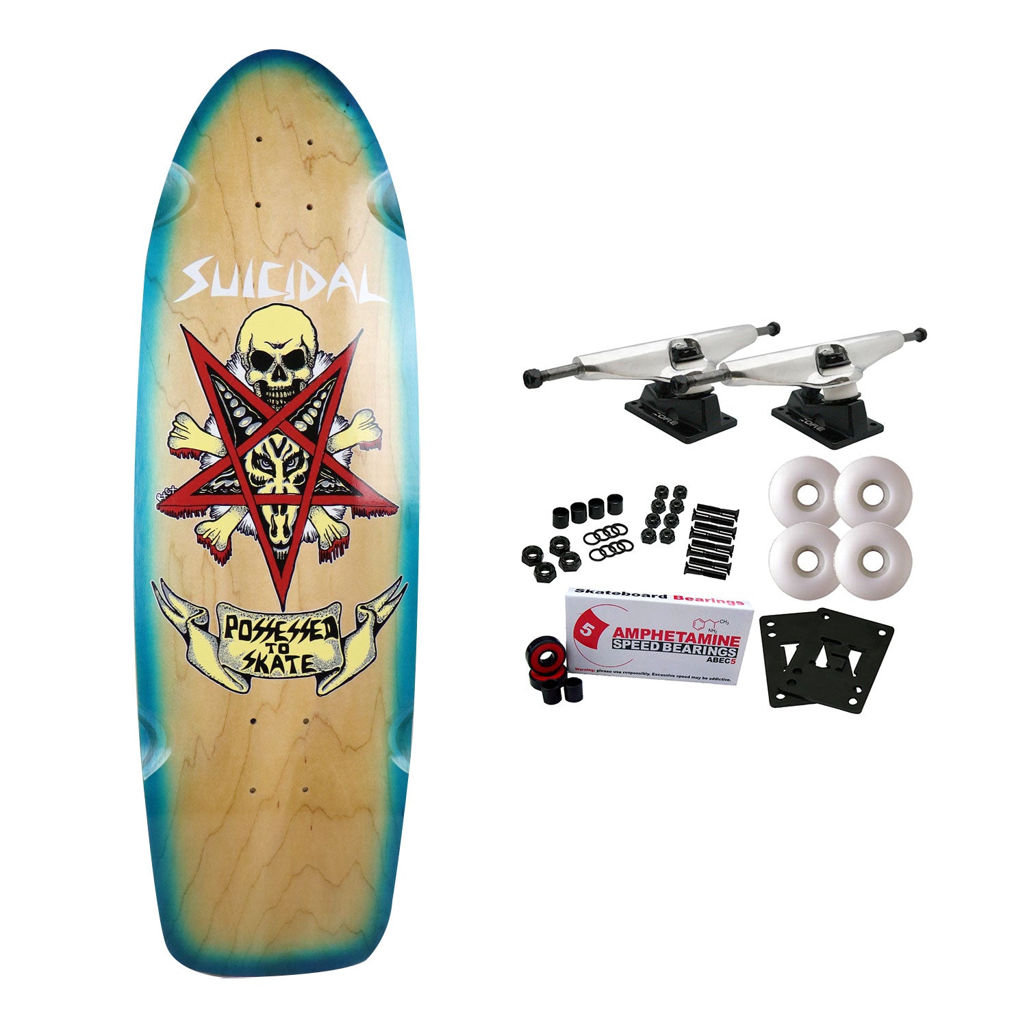 Suicidal Skates Possessed to Skate 70s Classic Deck wiht Art by Ric Clayton. 70s Classic Shape with a Mellow Concave. Measures 9" x 30" with a 16" wheelbase. Comes with Core trucks, 52mm TGM logo wheels, Amp abec 5 bearings, Black Diamond Griptape, risers, and hardware. Core trucks are light weight and feature heavy duty aluminum with grade 8 steel kingpins and axles, as well as USA made bushings and pivot cups. 52mm 99A are the perfect wheels for both street and park skating. Like the name states, Amp bearings are stimulants for your wheels! Light synthetic oil, Delrin Crowns, and Rubber Serviceable Shields are a few of the things that makes these bearings one of the best Abec 5 rated bearings on the market. Arrives un-assembled which allows for customization and a feeling of accomplishment. Skaters love building their boards! Easy to assemble!