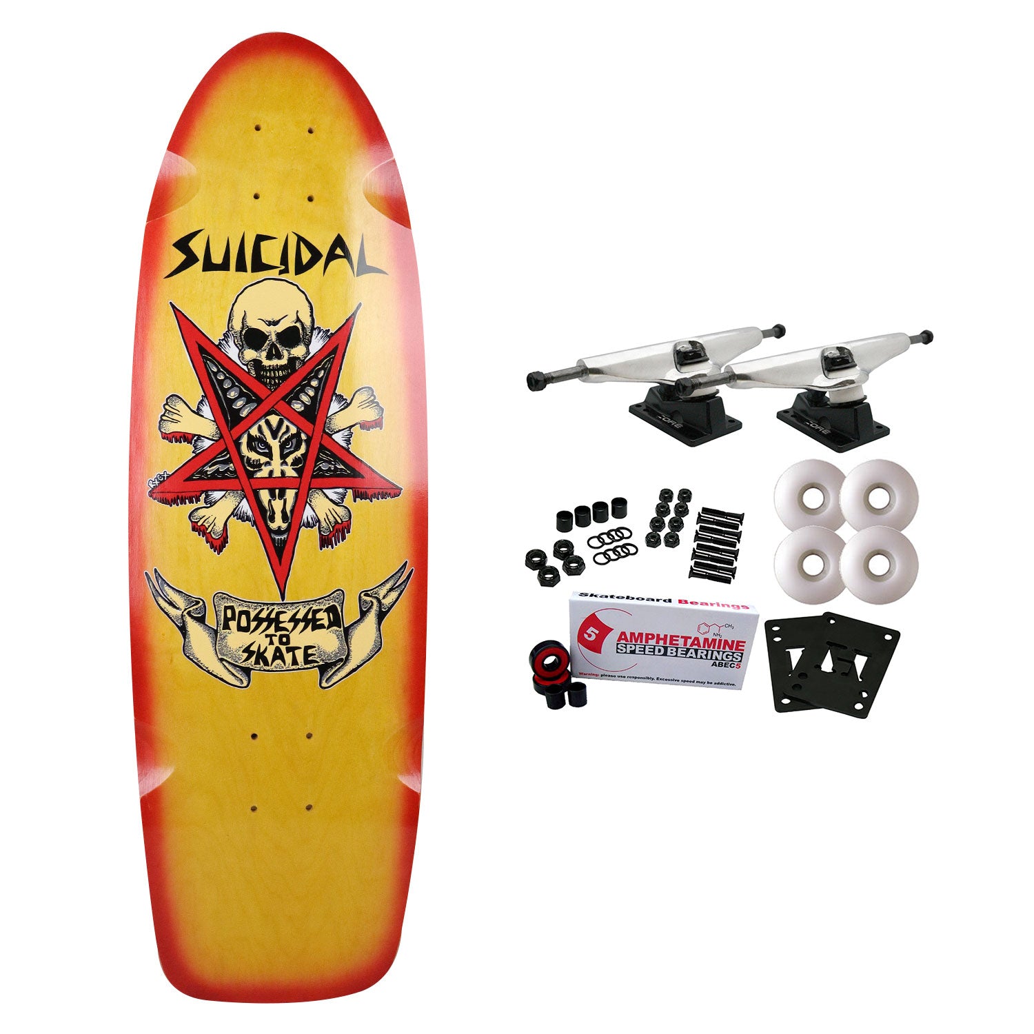 Suicidal Skates Possessed to Skate 70s Classic Deck wiht Art by Ric Clayton. 70s Classic Shape with a Mellow Concave. Measures 9" x 30" with a 16" wheelbase. Comes with Core trucks, 52mm TGM logo wheels, Amp abec 5 bearings, Black Diamond Griptape, risers, and hardware. Core trucks are light weight and feature heavy duty aluminum with grade 8 steel kingpins and axles, as well as USA made bushings and pivot cups. 52mm 99A are the perfect wheels for both street and park skating. Like the name states, Amp bearings are stimulants for your wheels! Light synthetic oil, Delrin Crowns, and Rubber Serviceable Shields are a few of the things that makes these bearings one of the best Abec 5 rated bearings on the market. Arrives un-assembled which allows for customization and a feeling of accomplishment. Skaters love building their boards! Easy to assemble!