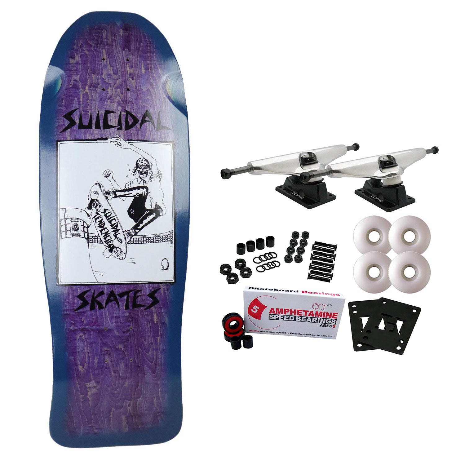 Suicidal Skates Pool Skater 80s Reissue Deck. Art by Lance Mountain. Made at PS Stix. Measures 10.12" x 30.32" with a 15.5" wheelbase. Comes with Core trucks, 58mm 97A wheels, Amp abec 5 bearings, Black Diamond Griptape, risers, and hardware. Core trucks are light weight and feature heavy duty aluminum with grade 8 steel kingpins and axles, as well as USA made bushings and pivot cups. 58mm 97A are the perfect wheels for both street and park skating. Like the name states, Amp bearings are stimulants for your wheels! Light synthetic oil, Delrin Crowns, and Rubber Serviceable Shields are a few of the things that makes these bearings one of the best Abec 5 rated bearings on the market. Arrives un-assembled which allows for customization and a feeling of accomplishment. Skaters love building their boards! Easy to assemble!