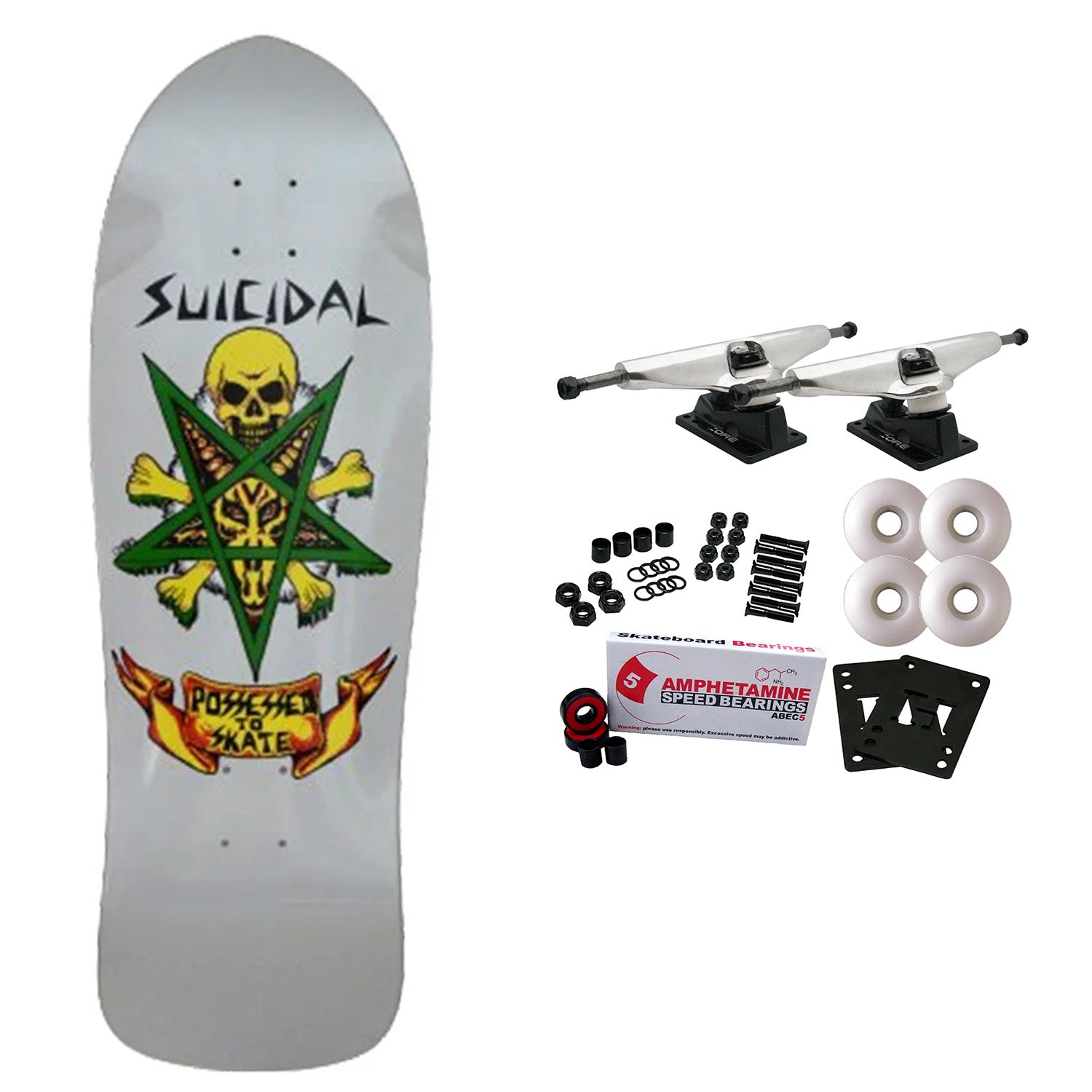 Comes with Core trucks, 58mm TGM logo wheels, Amp abec 5 bearings, Black Diamond Griptape, risers, and hardware. Core trucks are light weight and feature heavy duty aluminum with grade 8 steel kingpins and axles, as well as USA made bushings and pivot cups. 58mm 99A are the perfect wheels for both street and park skating. Like the name states, Amp bearings are stimulants for your wheels! Light synthetic oil, Delrin Crowns, and Rubber Serviceable Shields are a few of the things that makes these bearings one of the best Abec 5 rated bearings on the market. Arrives un-assembled which allows for customization and a feeling of accomplishment. Skaters love building their boards! Easy to assemble!