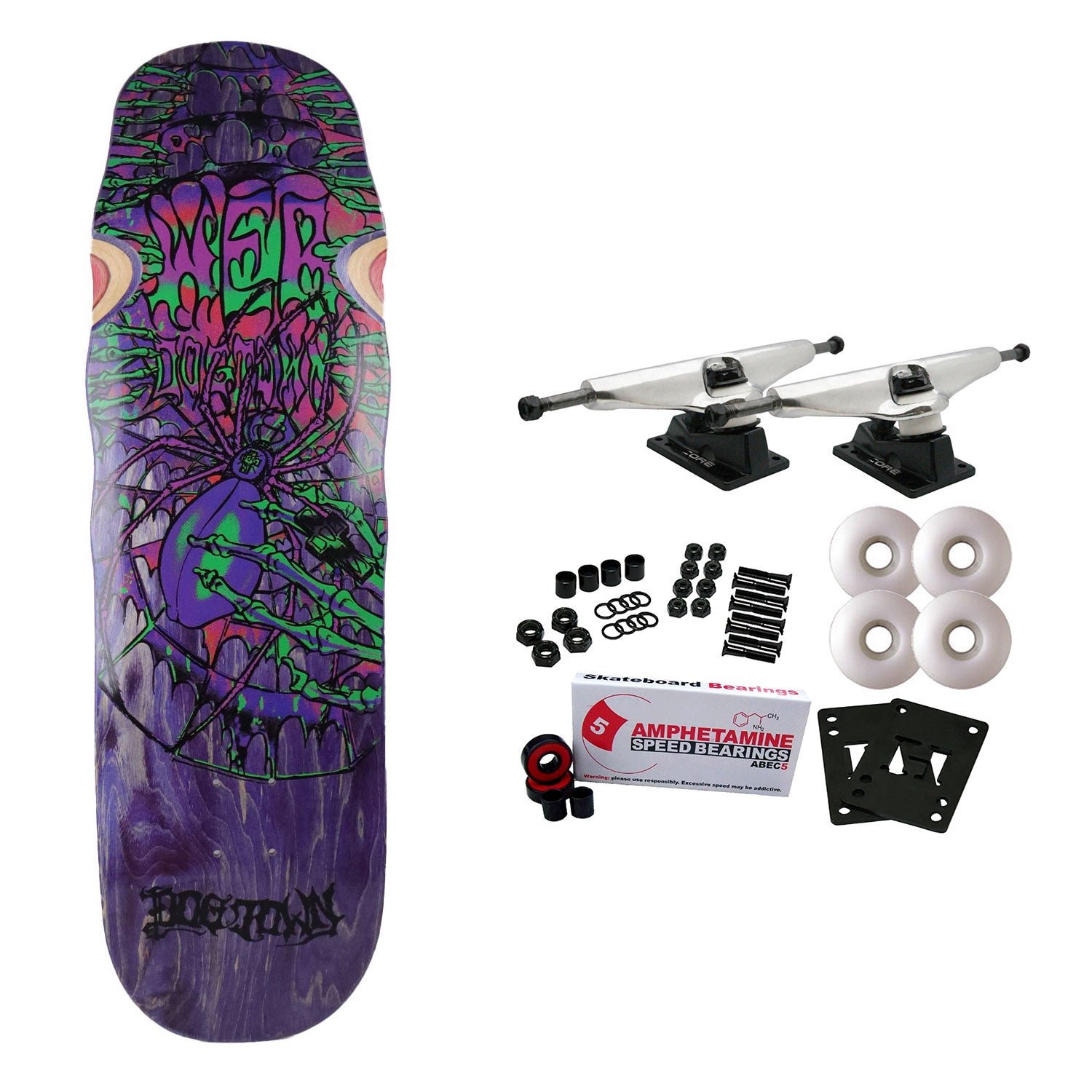 Dogtown Web Pool Deck. Modern Shape Designed off the 80s Web Mini. Front Wheel Wells. Made at PS Stix. Measures 9.25" x 32.2" with a 14.5" wheelbase. Comes with Core trucks, 58mm 97A wheels, Amp abec 5 bearings, Black Diamond Griptape, risers, and hardware. Core trucks are light weight and feature heavy duty aluminum with grade 8 steel kingpins and axles, as well as USA made bushings and pivot cups. 58mm 97A are the perfect wheels for both street and park skating. Like the name states, Amp bearings are stimulants for your wheels! Light synthetic oil, Delrin Crowns, and Rubber Serviceable Shields are a few of the things that makes these bearings one of the best Abec 5 rated bearings on the market. Arrives un-assembled which allows for customization and a feeling of accomplishment. Skaters love building their boards! Easy to assemble!