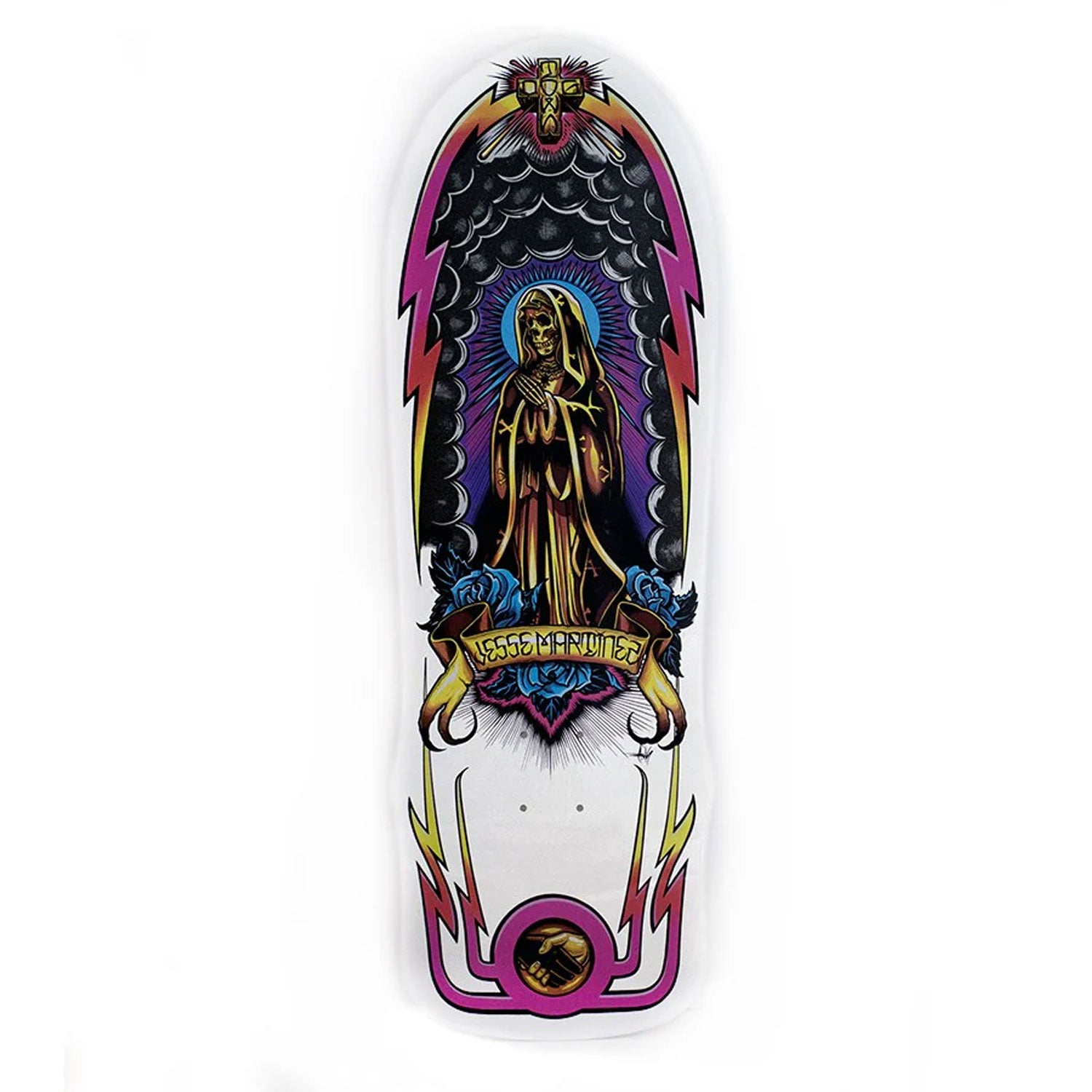 Dogtown Jesse Martinez Guadalupe Handshake 1987 deck. Jesse's 1987 Pro shape. Art by Axis. Made at BBS. White Full Dip. Measures 10" x 30.25" with a 15.5" wheelbase.