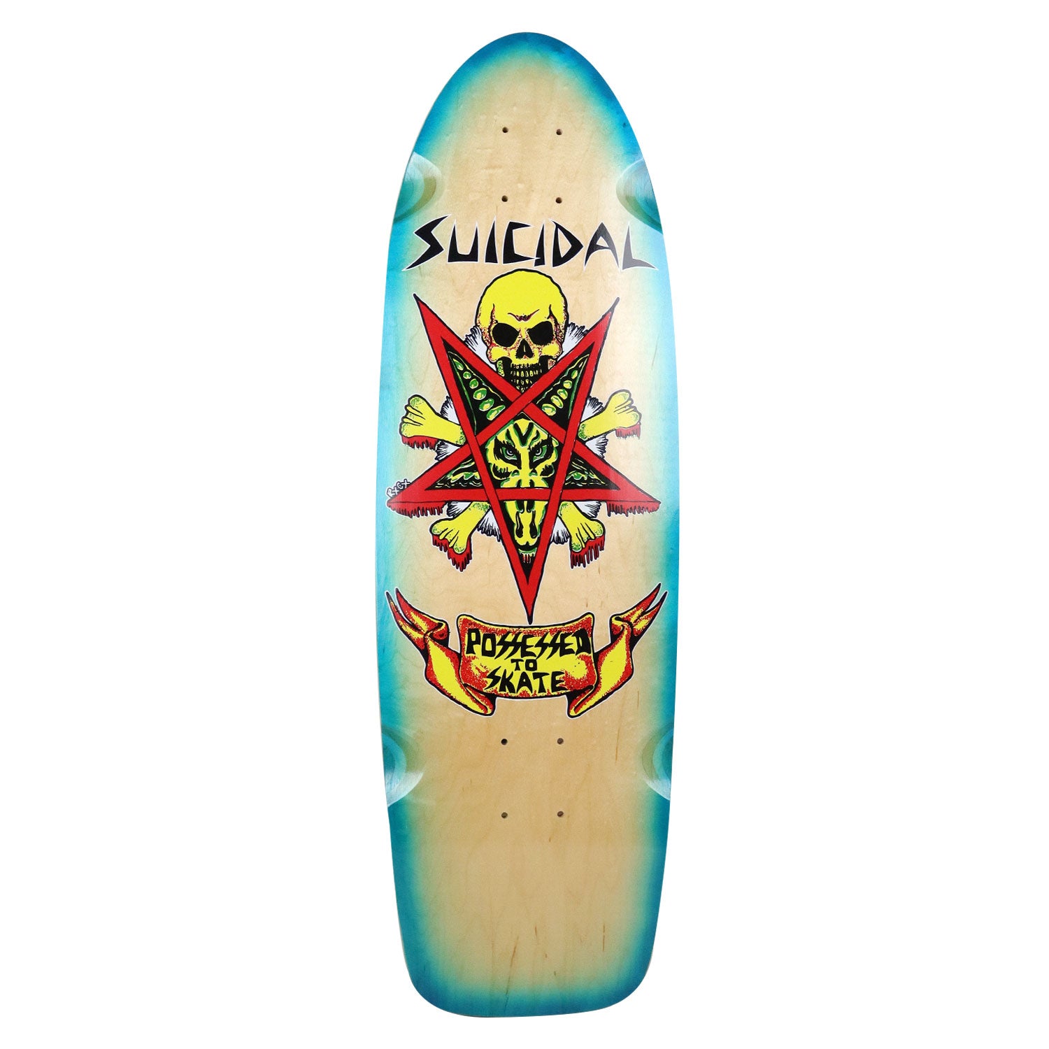 Suicidal Skates Possessed to Skate 70s Classic Deck wiht Art by Ric Clayton. 70s Classic Shape with a Mellow Concave. Measures 9" x 30" with a 16" wheelbase.
