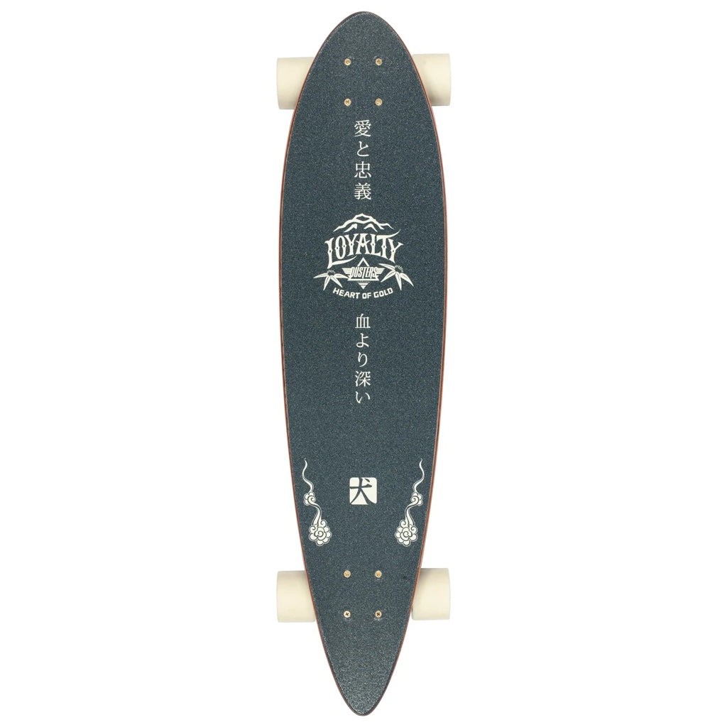 From Dusters California, the Inu Pintail is ready to ride. This board measures 8.75" x 37" with a 24.5" wheelbase. Built around a pintail shape and completed with Tensor 6.0" Trucks, precision speed bearings, and 71mm 78A Dusters wheels. Features Gold foil details and Printed griptape.