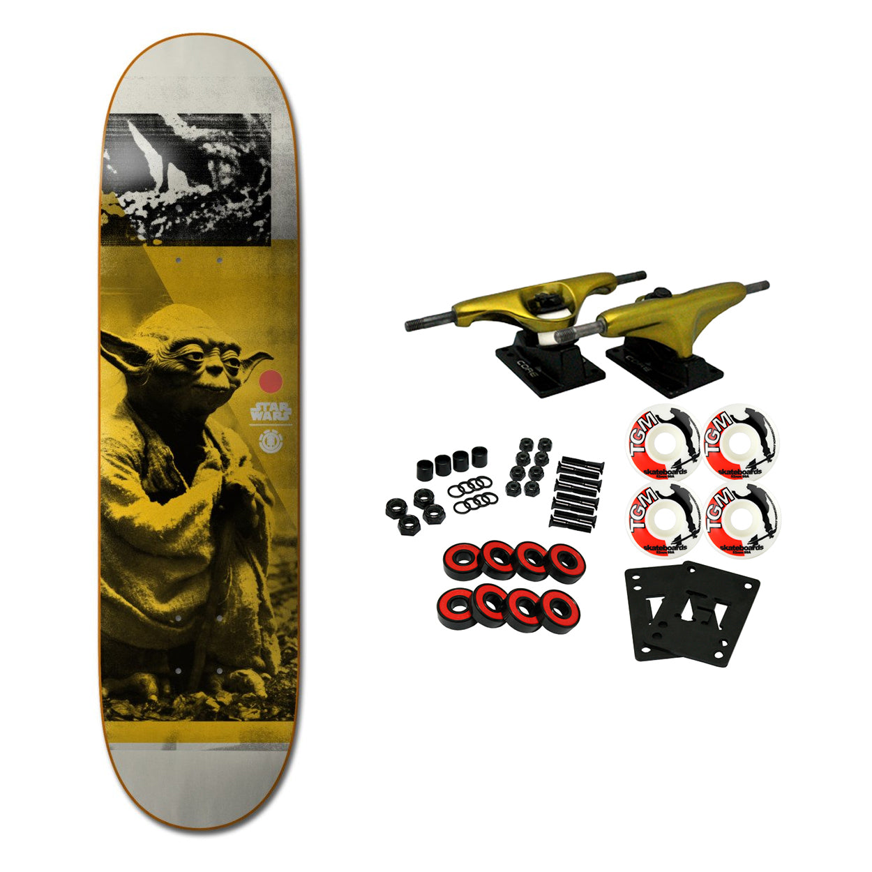 Everyone’s favorite Star Wars character decorates the underside of the Star Wars Yoda Skateboard Deck, a reliable go-to that features exclusive art from Element's collaboration with the legendary franchise. Constructed with 7-Ply North American Maple. This board measures 7.75" wide. Comes with Core trucks, 52mm TGM logo wheels, Amp abec 5 bearings, Black Diamond Griptape, risers, and hardware. Core trucks are light weight and feature heavy duty aluminum with grade 8 steel kingpins and axles, as well as USA made bushings and pivot cups. 52mm 99A are the perfect wheels for both street and park skating. Like the name states, Amp bearings are stimulants for your wheels! Light synthetic oil, Delrin Crowns, and Rubber Serviceable Shields are a few of the things that makes these bearings one of the best Abec 5 rated bearings on the market. Arrives un-assembled which allows for customization and a feeling of accomplishment. Skaters love building their boards! Easy to assemble!
