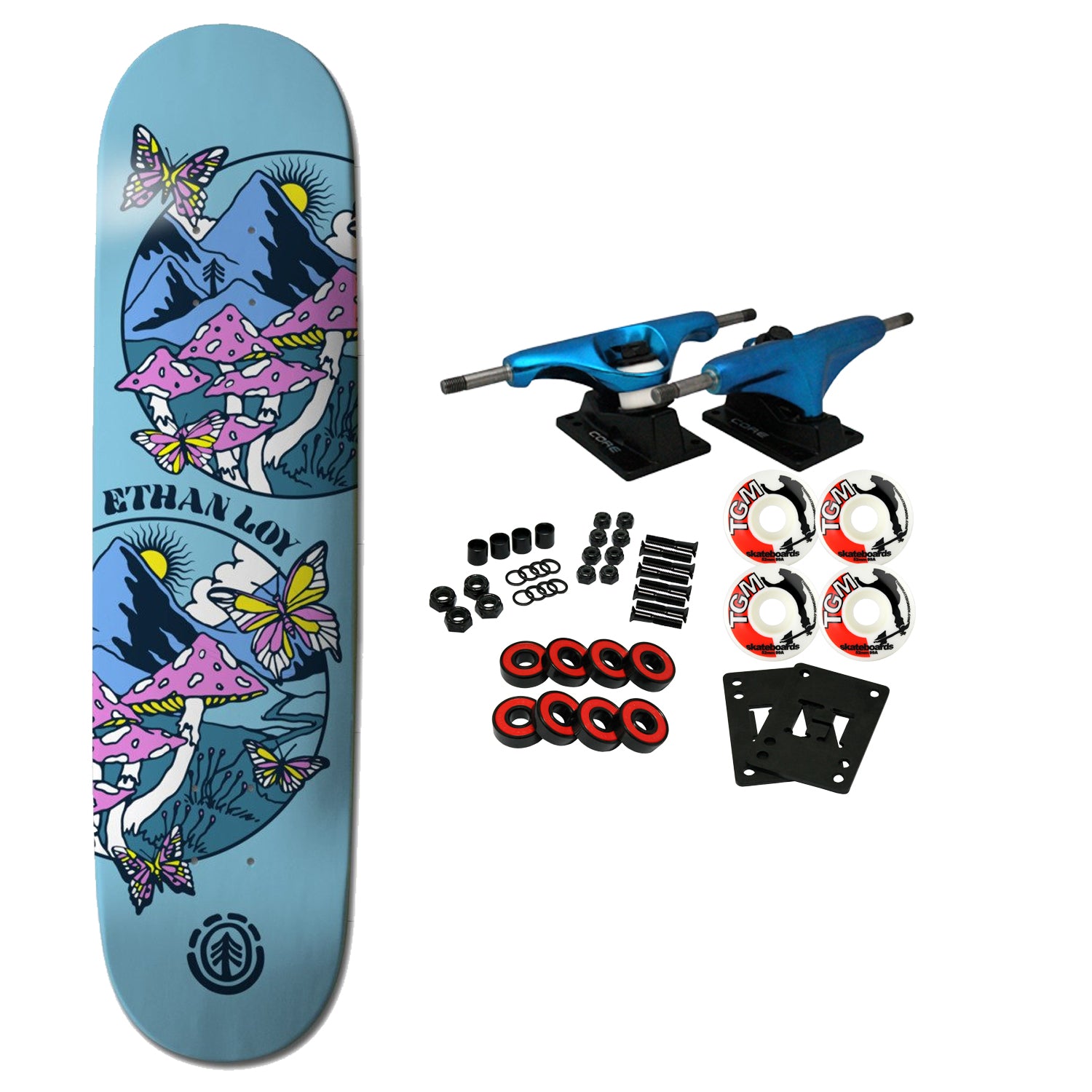 Made from 7-ply, premium maple wood, the Element skate deck delivers durable, lightweight performance. Comes with Core trucks, 52mm TGM logo wheels, Amp abec 5 bearings, Black Diamond Griptape, risers, and hardware. Core trucks are light weight and feature heavy duty aluminum with grade 8 steel kingpins and axles, as well as USA made bushings and pivot cups. 52mm 99A are the perfect wheels for both street and park skating. Like the name states, Amp bearings are stimulants for your wheels! Light synthetic oil, Delrin Crowns, and Rubber Serviceable Shields are a few of the things that makes these bearings one of the best Abec 5 rated bearings on the market. Arrives un-assembled which allows for customization and a feeling of accomplishment. Skaters love building their boards! Easy to assemble!