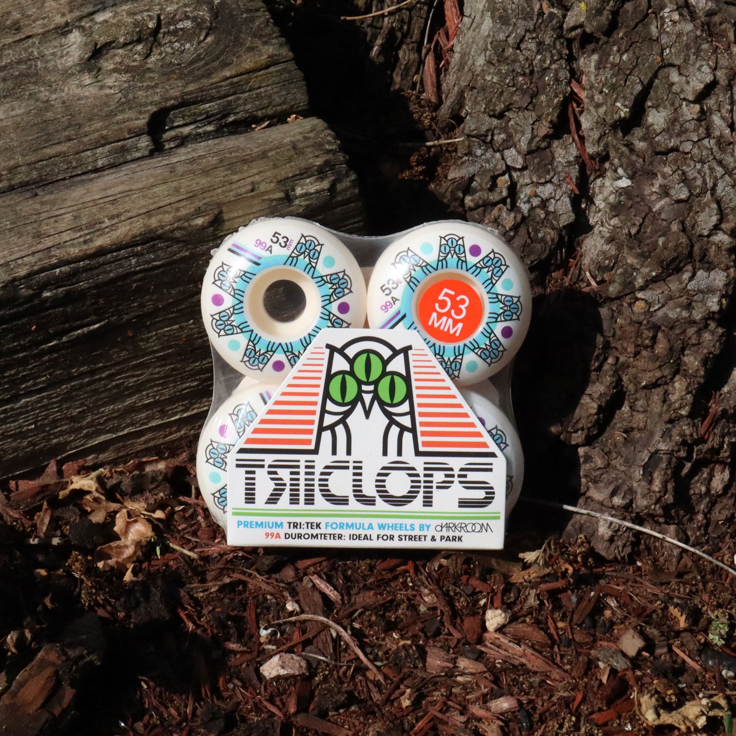 WHEELS: Triclops (USA Made) 53mm 99A Classic combo of size/duromter for all terrain skating. Custom 99A hardness, tested for all surfaces.