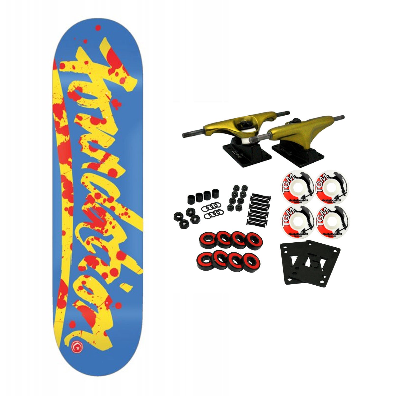 Foundation skateboard decks are constructed with 7-Ply North American Maple. This board measures 8.25" x 31.88" with a 14.25" wheelbase. Comes with Core trucks, 52mm TGM logo wheels, Amp abec 5 bearings, Black Diamond Griptape, risers, and hardware. Core trucks are light weight and feature heavy duty aluminum with grade 8 steel kingpins and axles, as well as USA made bushings and pivot cups. 52mm 99A are the perfect wheels for both street and park skating. Like the name states, Amp bearings are stimulants for your wheels! Light synthetic oil, Delrin Crowns, and Rubber Serviceable Shields are a few of the things that makes these bearings one of the best Abec 5 rated bearings on the market. Arrives un-assembled which allows for customization and a feeling of accomplishment. Skaters love building their boards! Easy to assemble!
