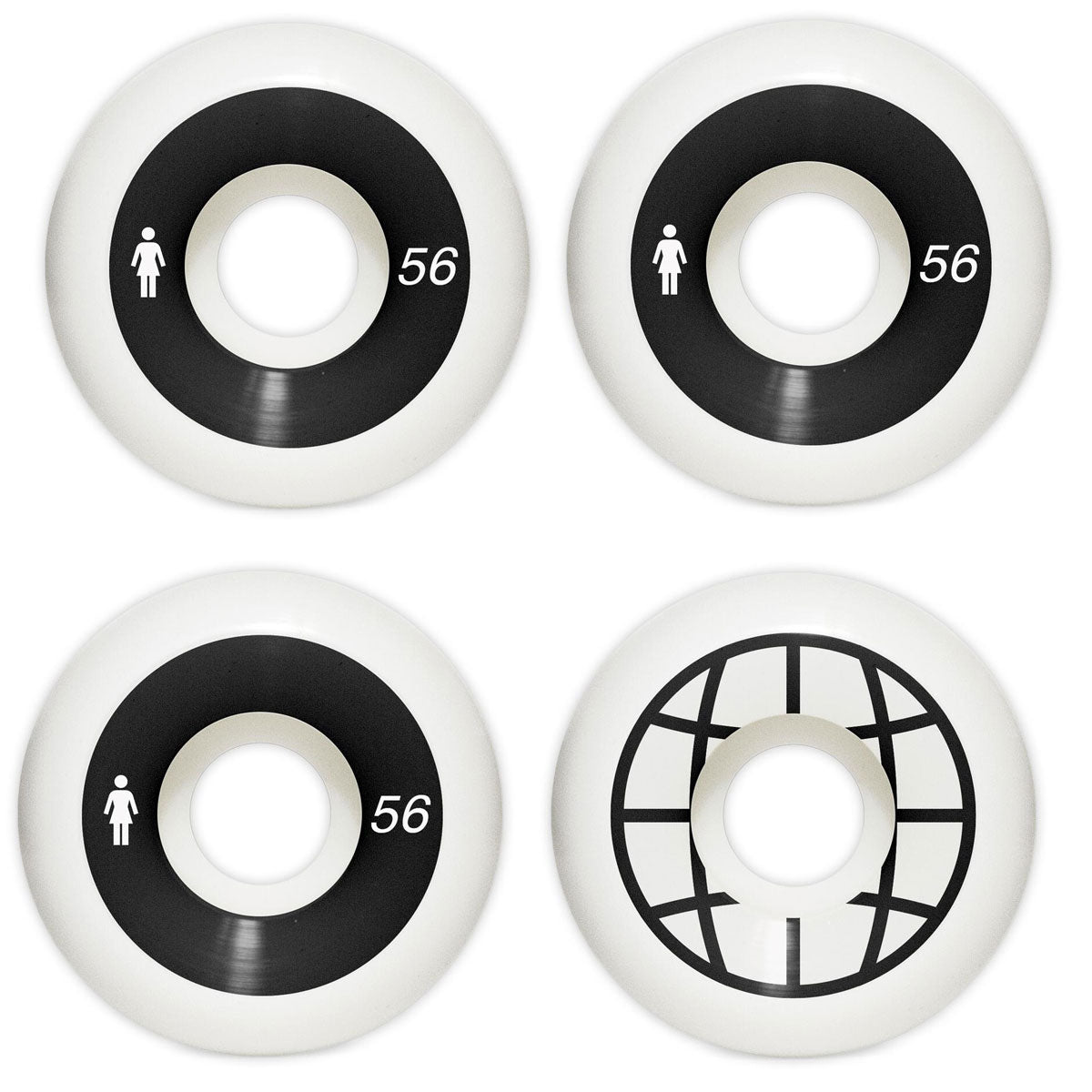 99A Durometer, Conical Shape Wheels from Girl Skateboards. Measures 56mm x 34mm.