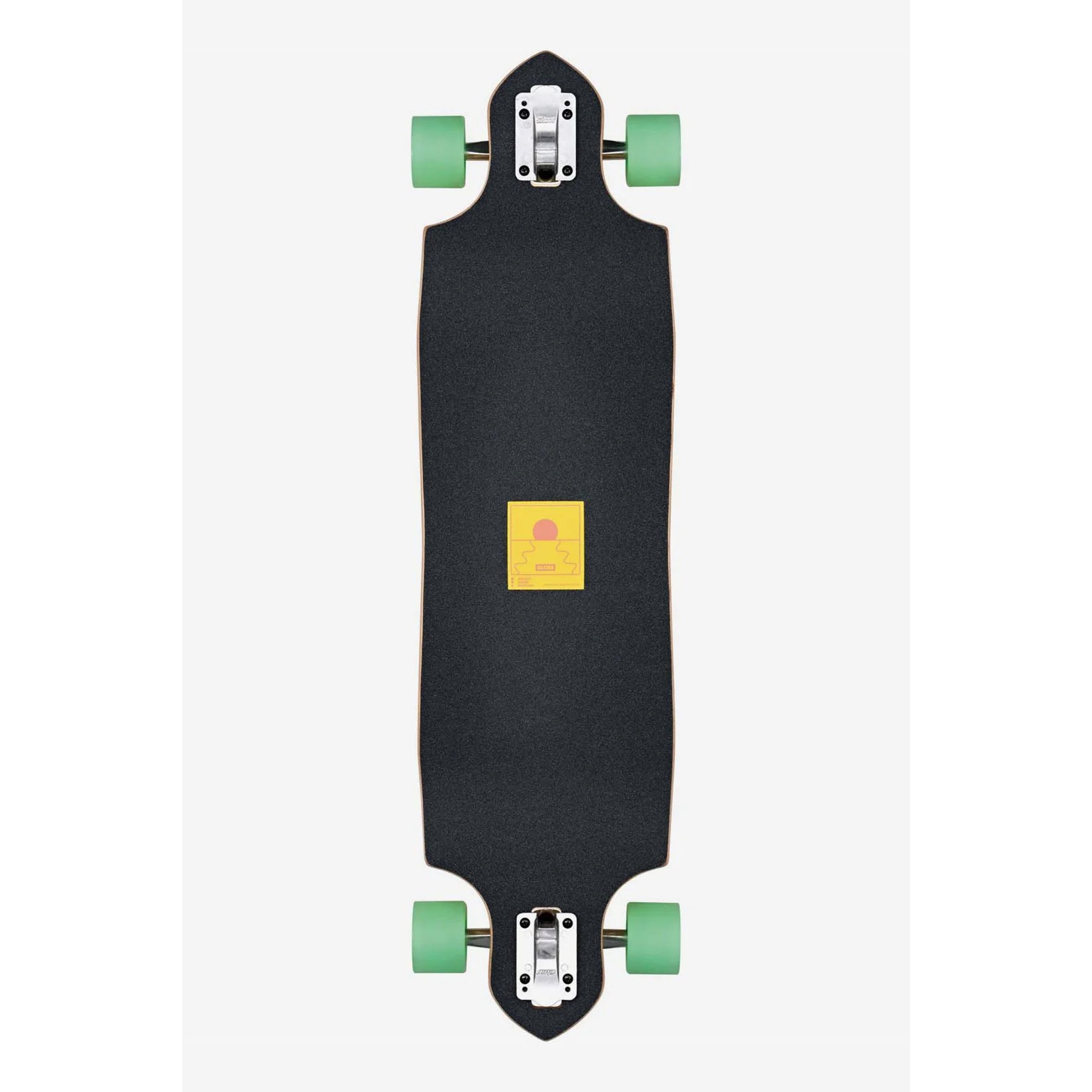 Symmetrical cut away longboard with slightly dropped standing area. The Geminon Micro-Drop in Tidal Force/Honey features Resin-8 hard rock maple deck construction with slightly dropped platform with slight W concave. Includes 180mm Slant reverse kingpin trucks, 70mm 83a conical cruiser wheel and finished with die-cut grip tape with top print.