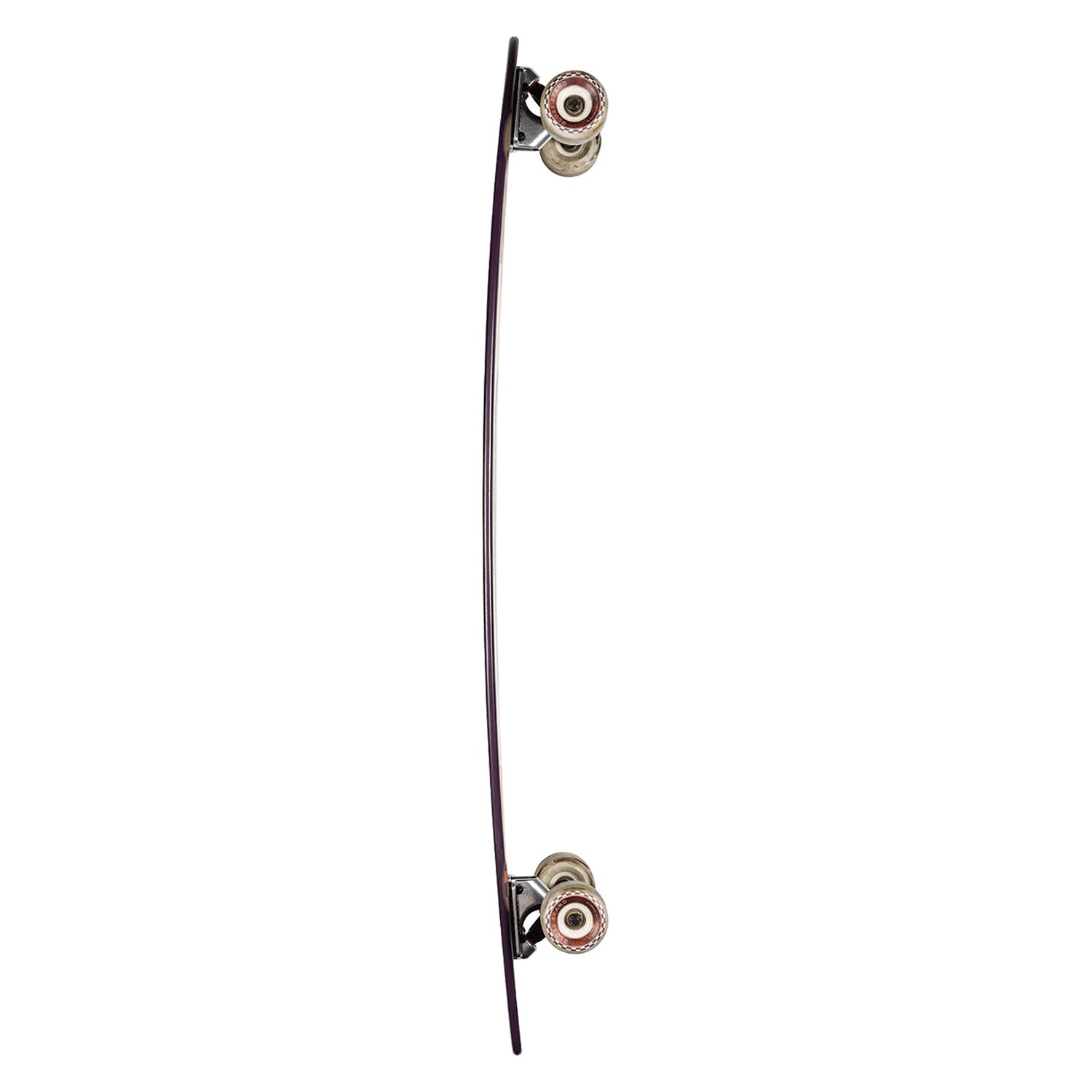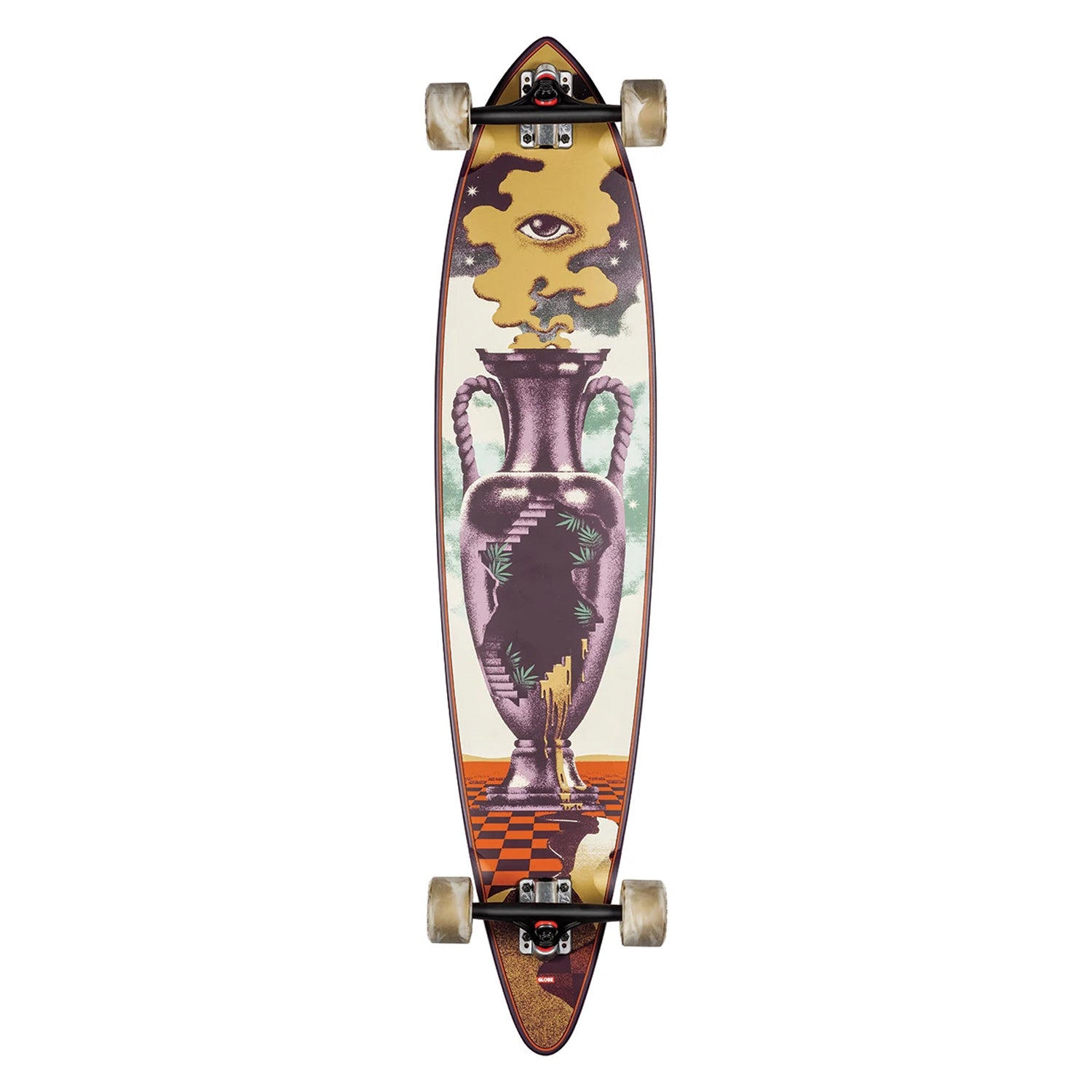 Resin-7 hard rock maple long flexy pintail longboard. 44" x 9.75" x 32.25" WB. Cambered flex and mellow side to side concave. 180mm Slant reverse kingpin trucks. 70mm 78a wheels. Printed griptape. Dipped deck. Featured artist series by Max Loeffler.