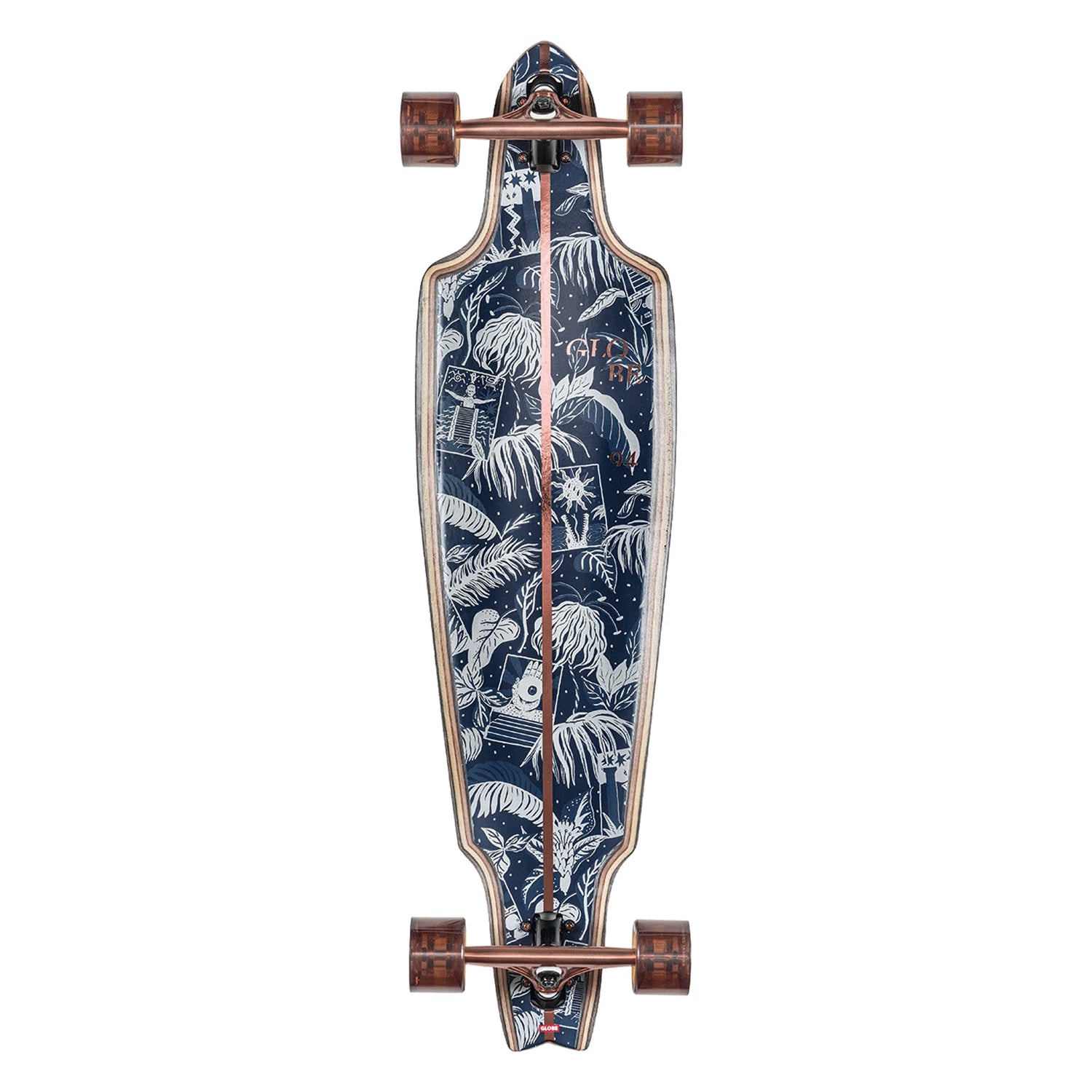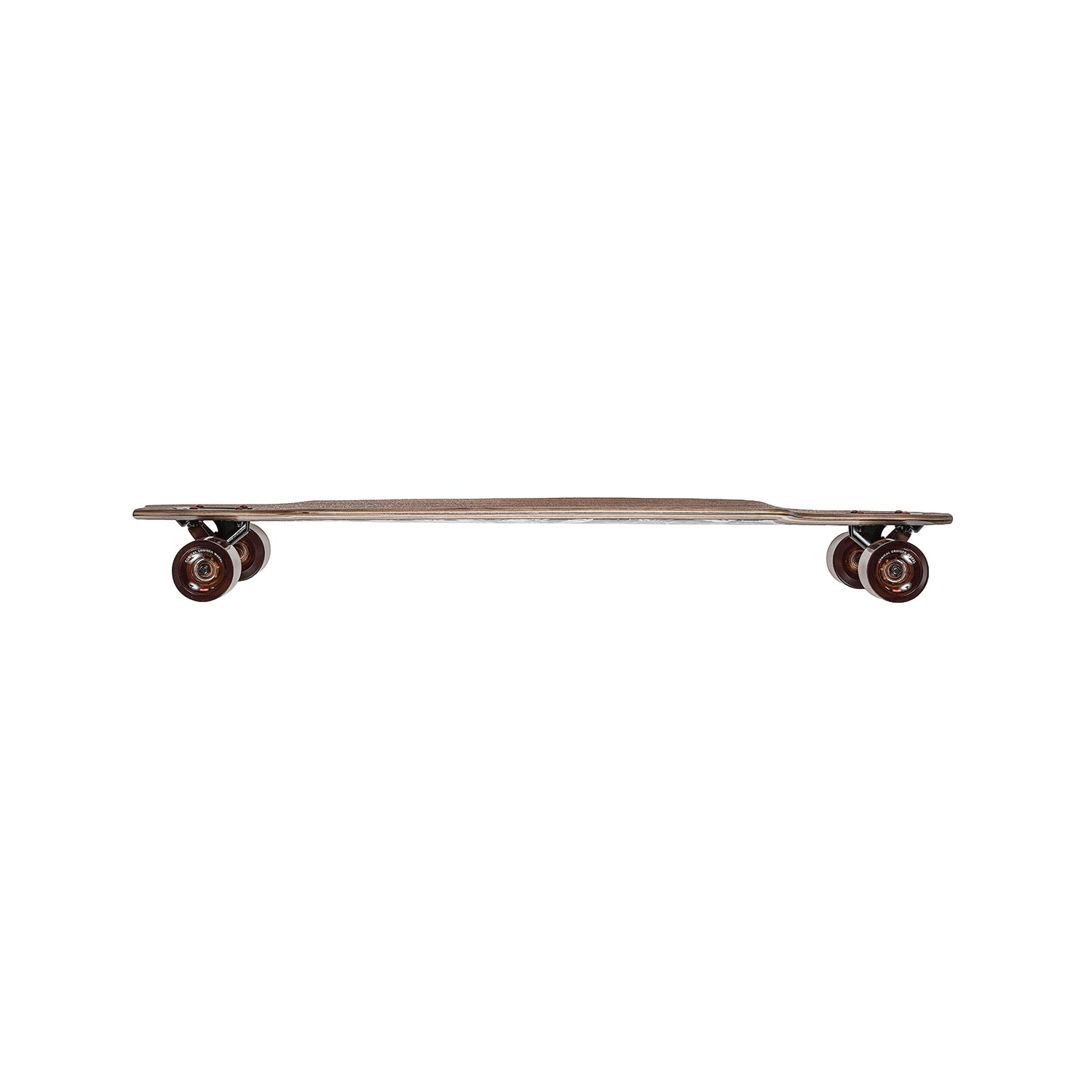 Flush-mounted drop-through style with cutaway wheel wells. Hard rock maple. Mellow side-to-side concave. Clear grip tape. 180mm Slant aluminum reverse kingpin trucks. 70mm 78a wheels.