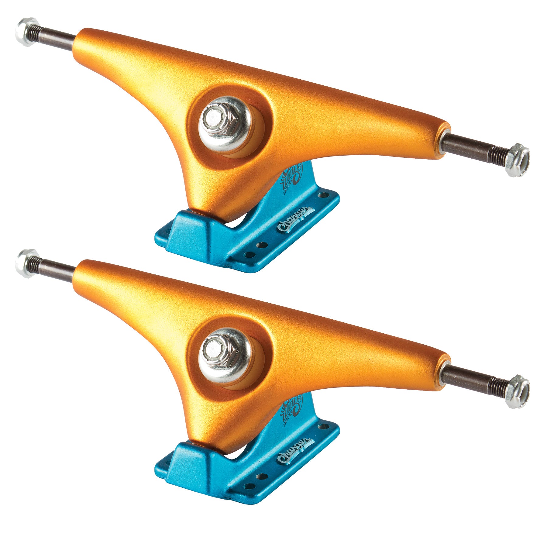 Gullwing Charger trucks feature a reverse kingpin style, best used for cruising and carving, and the knurled kingpin stays securely in place while riding all types of terrain. The 356 Aluminum and Chromoly axle have become the gold-standard of the truck industry and have proven themselves through years of use and abuse. This heat-treated aluminum cannot be die-cast, and is responsible for the strength and familiar grind characteristics you should expect from a quality truck. Additional benefits come from the integrated speed ring on both the raked hanger and axle nut. The rings provide improved alignment to your bearings, for better speed roll and longevity. They also reduce friction, by only touching the inner race of the bearing and because they are integrated, you can’t lose them! Charger trucks feature a 6-hole baseplate for old school or new school mounting and come with 89A conical bushings. Additionally, these trucks have a weight-saving pocketed hanger design and a 50-degree weight-saving baseplate.
