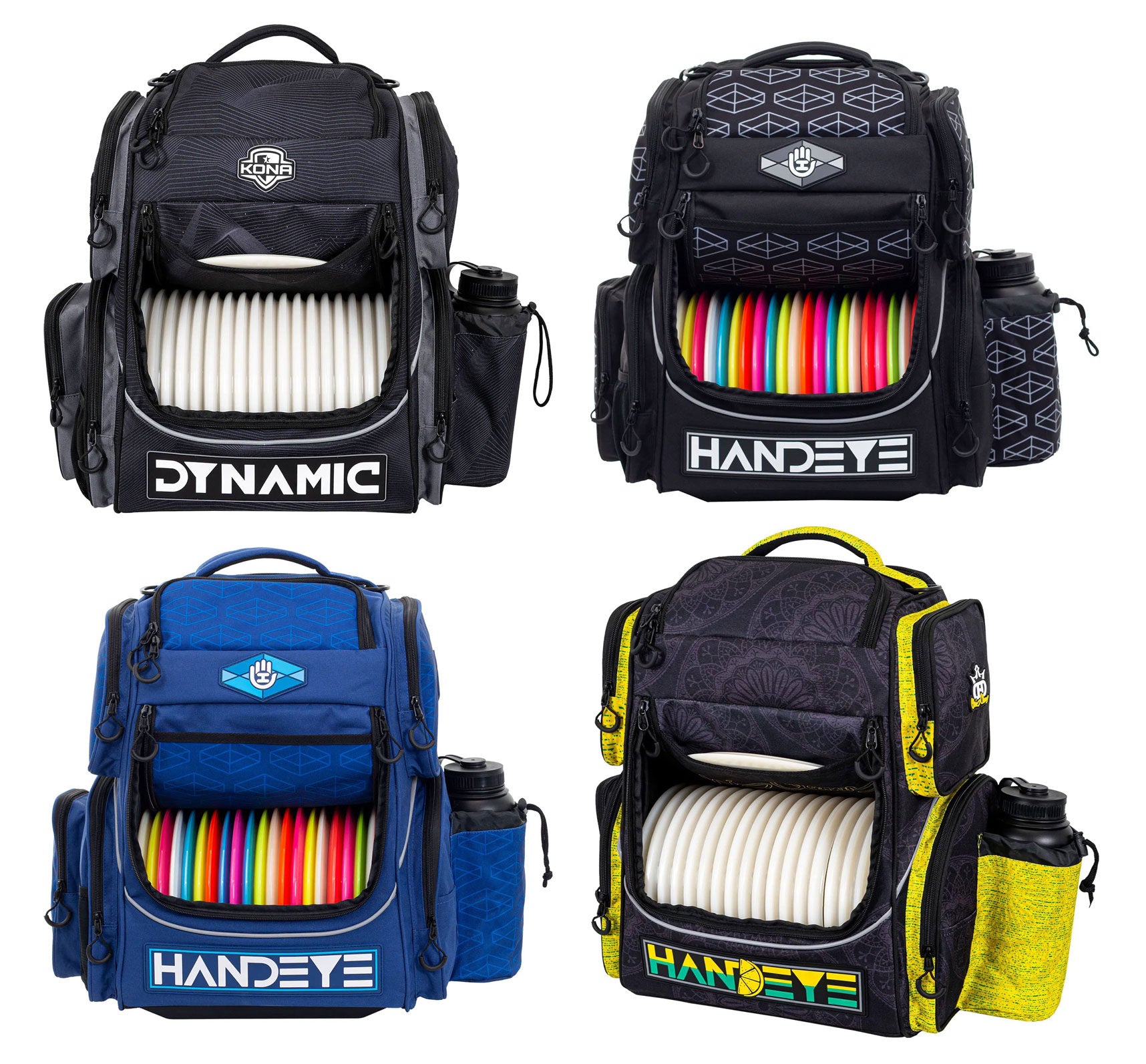 Features:Large main disc compartment holds 18+ discs Large upper storage compartment for extra discs, multiple jackets, towels, and more Zip-up putter pouch above the straps for easy access or additional storage Removable lightweight disc divider located inside main disc compartment PVC Handeye Supply Co Patches Large exterior drawstring water bottle holder Exterior Towel Clips Looped and easy to grab zipper handles Two interior mesh pouches to secure valuables Two large exterior pockets for more discs or large items Three medium exterior accessory pockets Velcro tabs keep the opening flap clear of discs for easy access Padded back and shoulder straps Opening flap features space for quick access to your favorite disc Reinforced feet and water resistant bottom to keep your bag upright and dry Exterior mesh and canvas pockets for pencils, scorecards, mini disc marker, etc