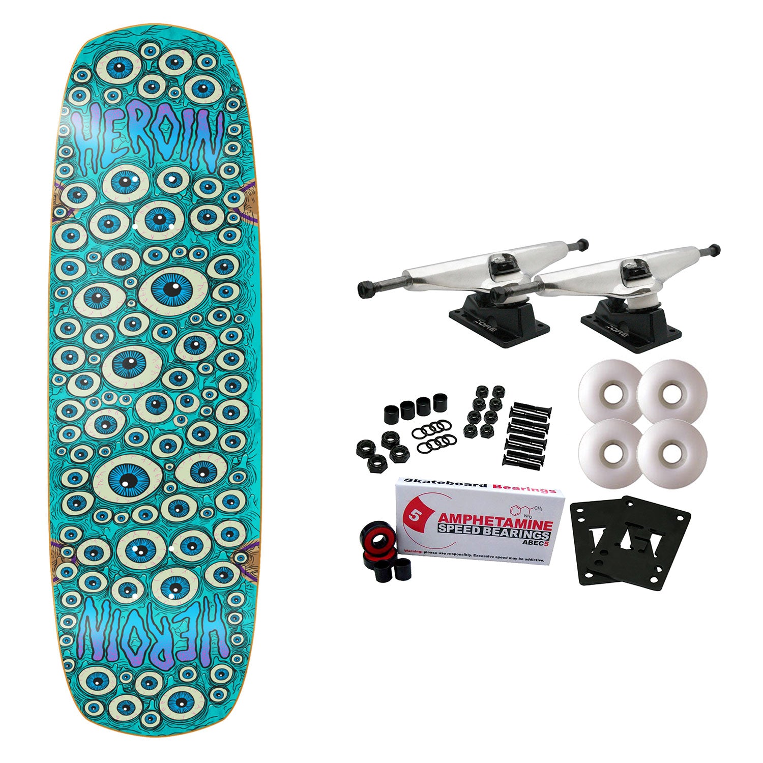 Heroin Decks are made with premium North American Maple. Wheel Wells. Razor Edge Construction. Custom Shape. Comes with Core trucks, 58mm 97A wheels, Amp abec 5 bearings, Black Diamond Griptape, risers, and hardware. Core trucks are light weight and feature heavy duty aluminum with grade 8 steel kingpins and axles, as well as USA made bushings and pivot cups. 58mm 97A are the perfect wheels for both street and park skating. Like the name states, Amp bearings are stimulants for your wheels! Light synthetic oil, Delrin Crowns, and Rubber Serviceable Shields are a few of the things that makes these bearings one of the best Abec 5 rated bearings on the market. Arrives un-assembled which allows for customization and a feeling of accomplishment. Skaters love building their boards! Easy to assemble!