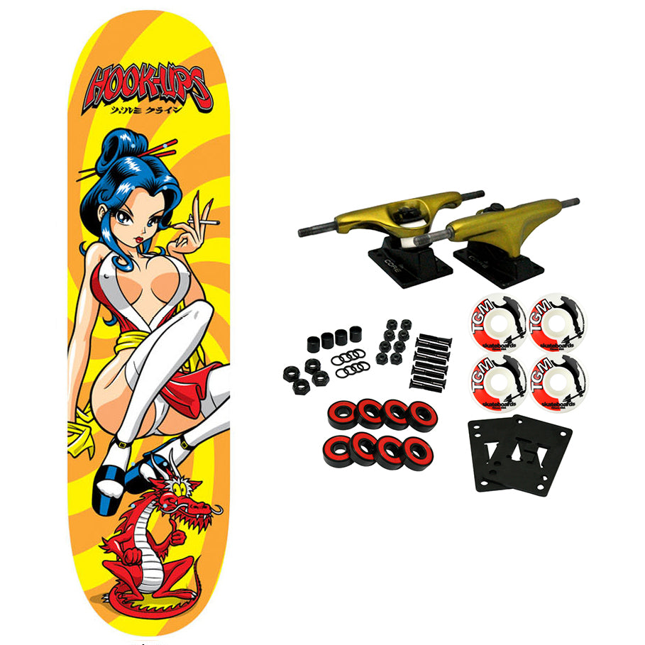 Hook Ups skateboard decks are made with premium 7-Ply North American Maple. Comes with Core trucks, 52mm TGM logo wheels, Amp abec 5 bearings, Black Diamond Griptape, risers, and hardware. Core trucks are light weight and feature heavy duty aluminum with grade 8 steel kingpins and axles, as well as USA made bushings and pivot cups. 52mm 99A are the perfect wheels for both street and park skating. Like the name states, Amp bearings are stimulants for your wheels! Light synthetic oil, Delrin Crowns, and Rubber Serviceable Shields are a few of the things that makes these bearings one of the best Abec 5 rated bearings on the market. Arrives un-assembled which allows for customization and a feeling of accomplishment. Skaters love building their boards! Easy to assemble!