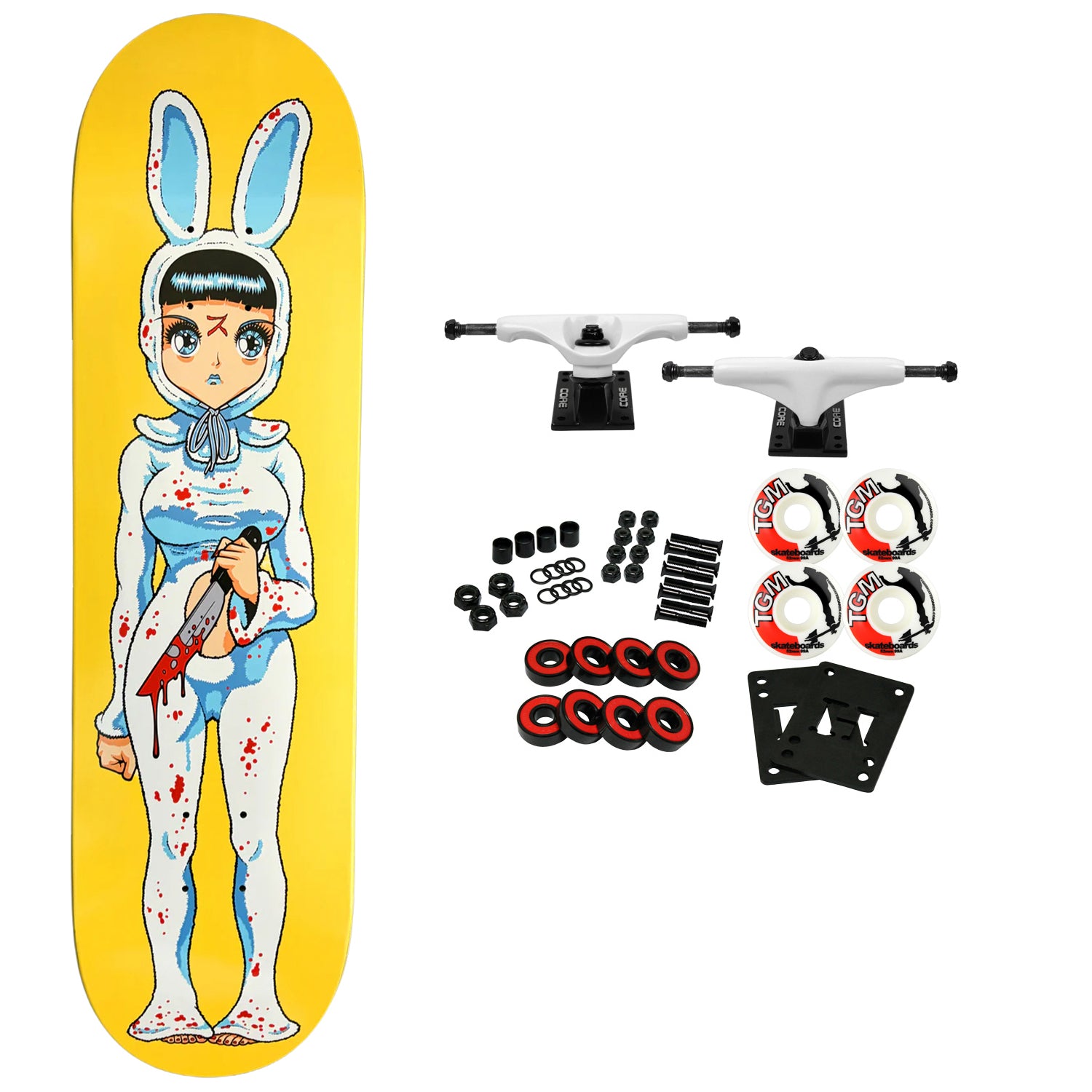 Comes with Core trucks, 52mm TGM logo wheels, Amp abec 5 bearings, Black Diamond Griptape, risers, and hardware. Core trucks are light weight and feature heavy duty aluminum with grade 8 steel kingpins and axles, as well as USA made bushings and pivot cups. 52mm 99A are the perfect wheels for both street and park skating. Like the name states, Amp bearings are stimulants for your wheels! Light synthetic oil, Delrin Crowns, and Rubber Serviceable Shields are a few of the things that makes these bearings one of the best Abec 5 rated bearings on the market. Arrives un-assembled which allows for customization and a feeling of accomplishment. Skaters love building their boards! Easy to assemble!