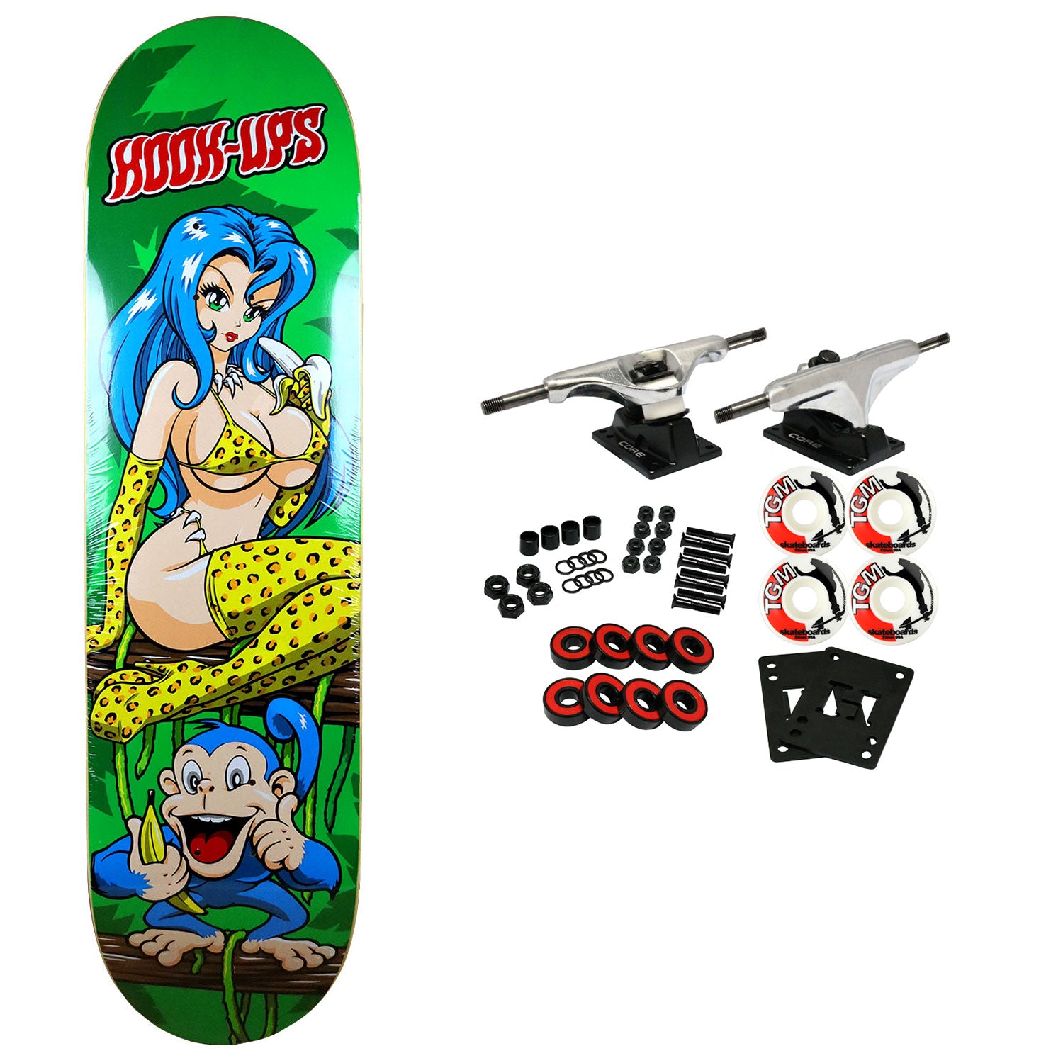 Hook Ups skateboard decks are made with premium 7-Ply North American Maple. Comes with Core trucks, 52mm TGM logo wheels, Amp abec 5 bearings, Black Diamond Griptape, risers, and hardware. Core trucks are light weight and feature heavy duty aluminum with grade 8 steel kingpins and axles, as well as USA made bushings and pivot cups. 52mm 99A are the perfect wheels for both street and park skating. Like the name states, Amp bearings are stimulants for your wheels! Light synthetic oil, Delrin Crowns, and Rubber Serviceable Shields are a few of the things that makes these bearings one of the best Abec 5 rated bearings on the market. Arrives un-assembled which allows for customization and a feeling of accomplishment. Skaters love building their boards! Easy to assemble!