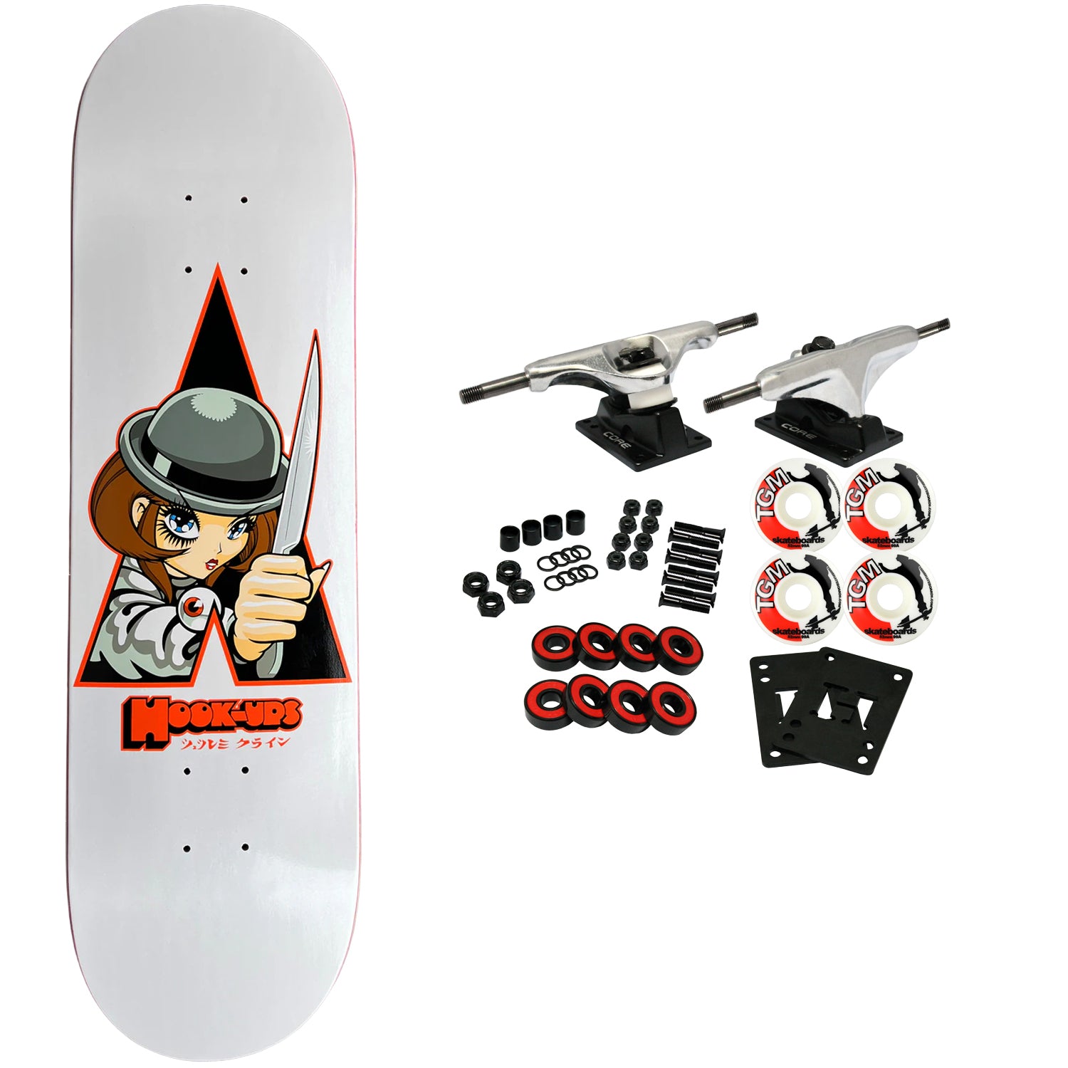 Hook Ups skateboard decks are made with premium 7-Ply North American Maple. This board measures 8.5" x 32.25" with a 14.25" wheelbase. Comes with Core trucks, 52mm TGM logo wheels, Amp abec 5 bearings, Black Diamond Griptape, risers, and hardware. Core trucks are light weight and feature heavy duty aluminum with grade 8 steel kingpins and axles, as well as USA made bushings and pivot cups. 52mm 99A are the perfect wheels for both street and park skating. Like the name states, Amp bearings are stimulants for your wheels! Light synthetic oil, Delrin Crowns, and Rubber Serviceable Shields are a few of the things that makes these bearings one of the best Abec 5 rated bearings on the market. Arrives un-assembled which allows for customization and a feeling of accomplishment. Skaters love building their boards! Easy to assemble!