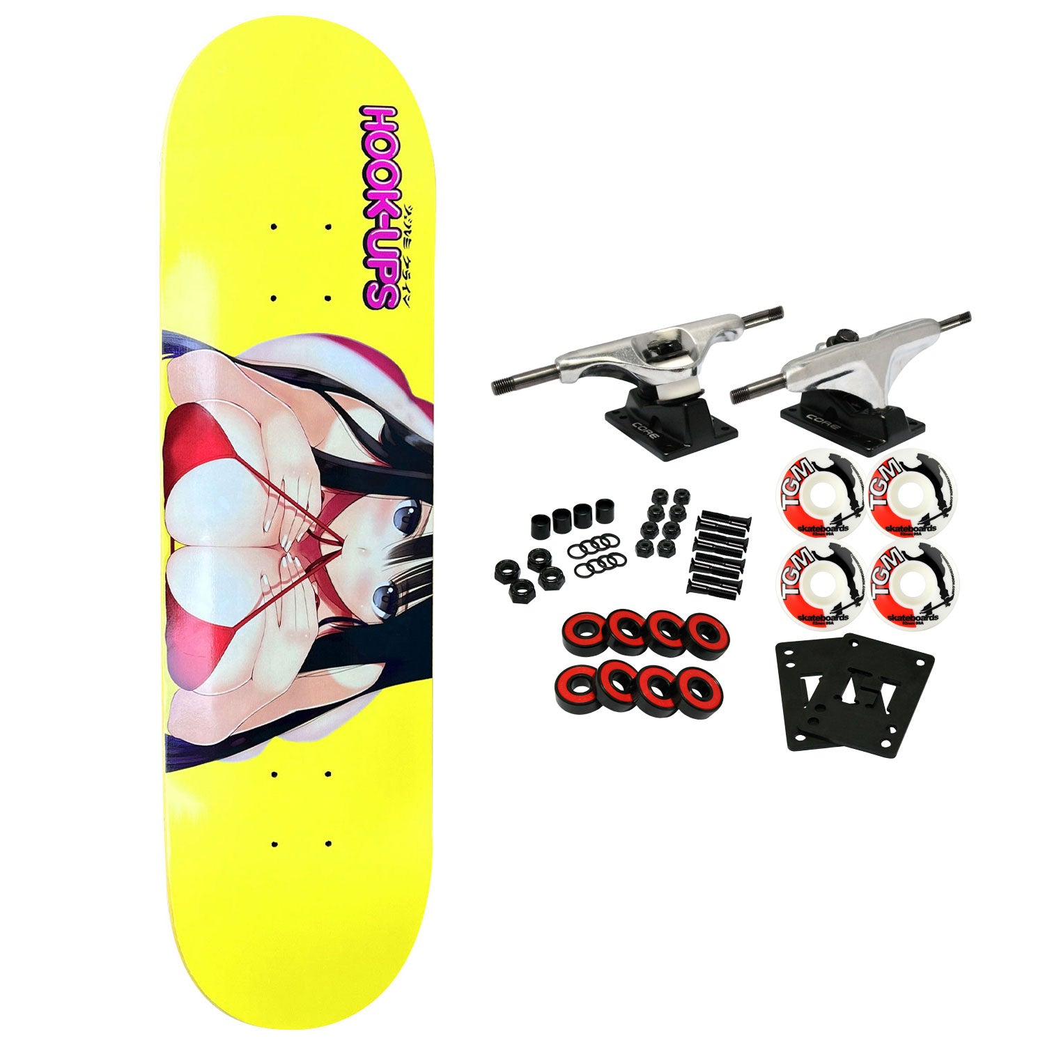 Hook Ups skateboard decks are made with premium 7-Ply North American Maple. Comes with Core trucks, 52mm TGM logo wheels, Amp abec 5 bearings, Black Diamond Griptape, risers, and hardware. Core trucks are light weight and feature heavy duty aluminum with grade 8 steel kingpins and axles, as well as USA made bushings and pivot cups. 52mm 99A are the perfect wheels for both street and park skating. Like the name states, Amp bearings are stimulants for your wheels! Light synthetic oil, Delrin Crowns, and Rubber Serviceable Shields are a few of the things that makes these bearings one of the best Abec 5 rated bearings on the market. Arrives un-assembled which allows for customization and a feeling of accomplishment. Skaters love building their boards! Easy to assemble!