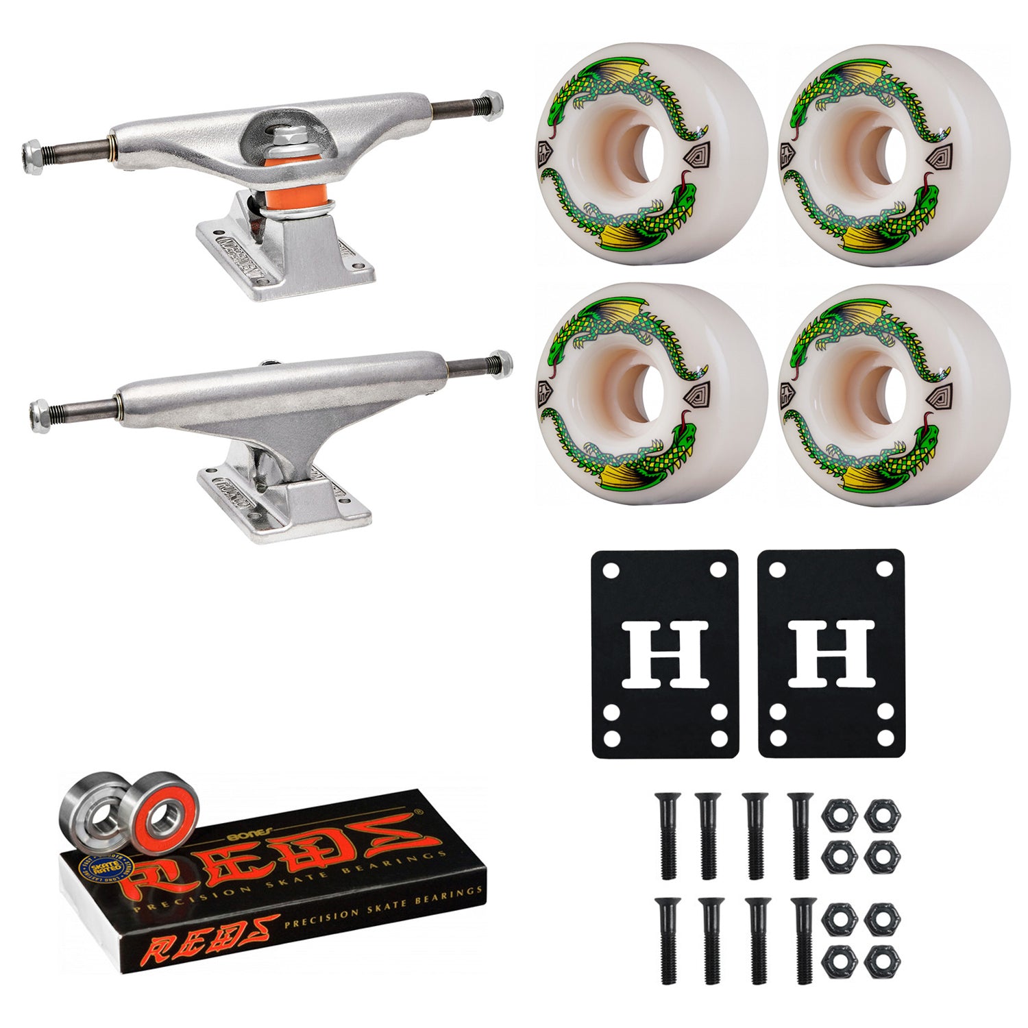 This Independent Trucks Kit features Stage 11 Raw Indy trucks, new Powell Peralta Dragon Formula Wheels, Bones Reds Bearings, 1/8" risers, and 1" black hardware. Independent Stage 11 trucks are durable and high performing for all types of skating. The New Dragon Formula from Powell Peralta features the grip and slide of 99a and 101a wheels, but the durability and softness for all terrain riding. Bones Reds are the best and most popular priced bearing on the market. High quality mixed with low cost make these the go-to bearing for skaters worldwide.