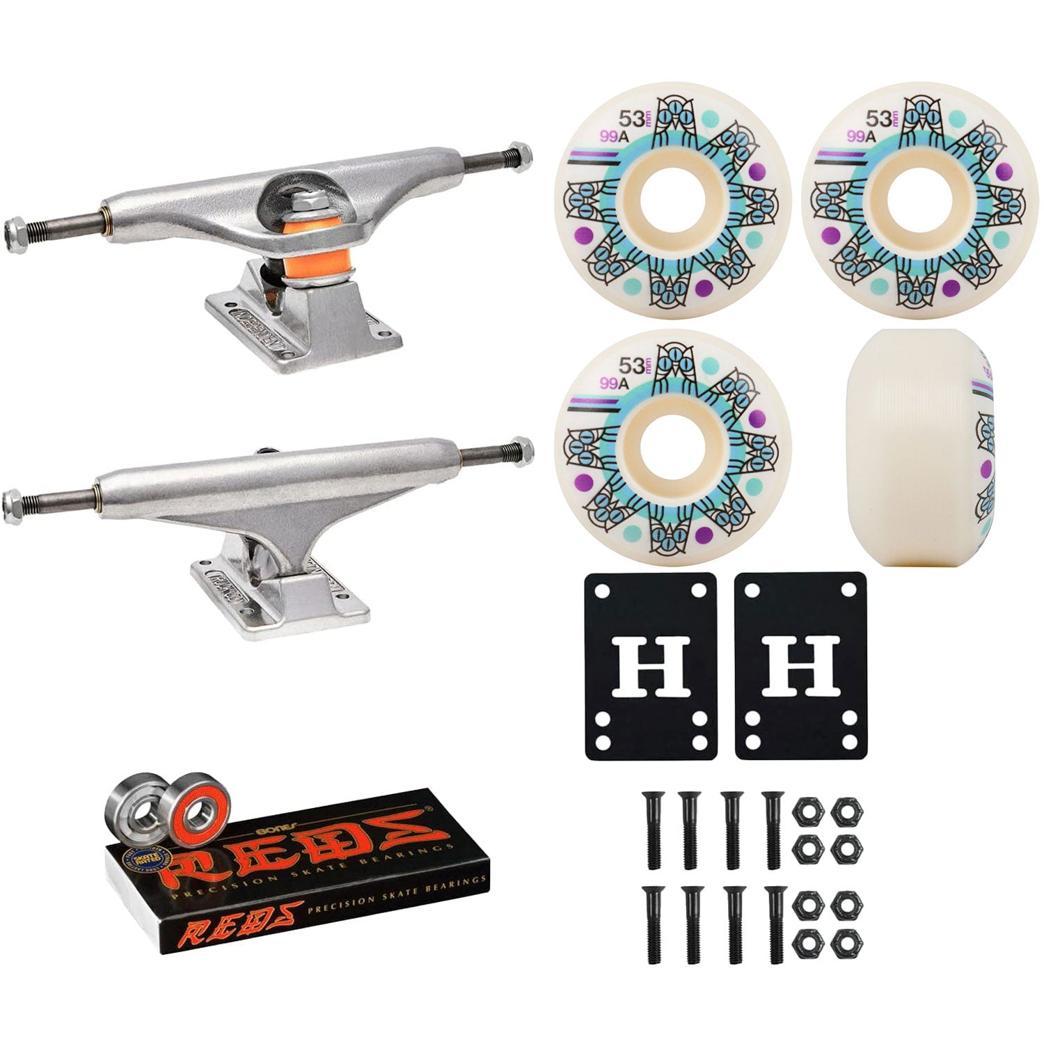 This Independent Trucks Kit feautres Stage 11 Raw Indy trucks, new Triclops Skateboard wheels, Bones Reds Bearings, 1/8" Risers, and 1" Black Hardware. Independent Stage 11 trucks are durable and high performing for all types of skating. Bones Reds bearings are the best and most popular priced bearing on the market. High quality mixed with low cost make these the go-to bearing for skaters worldwide.