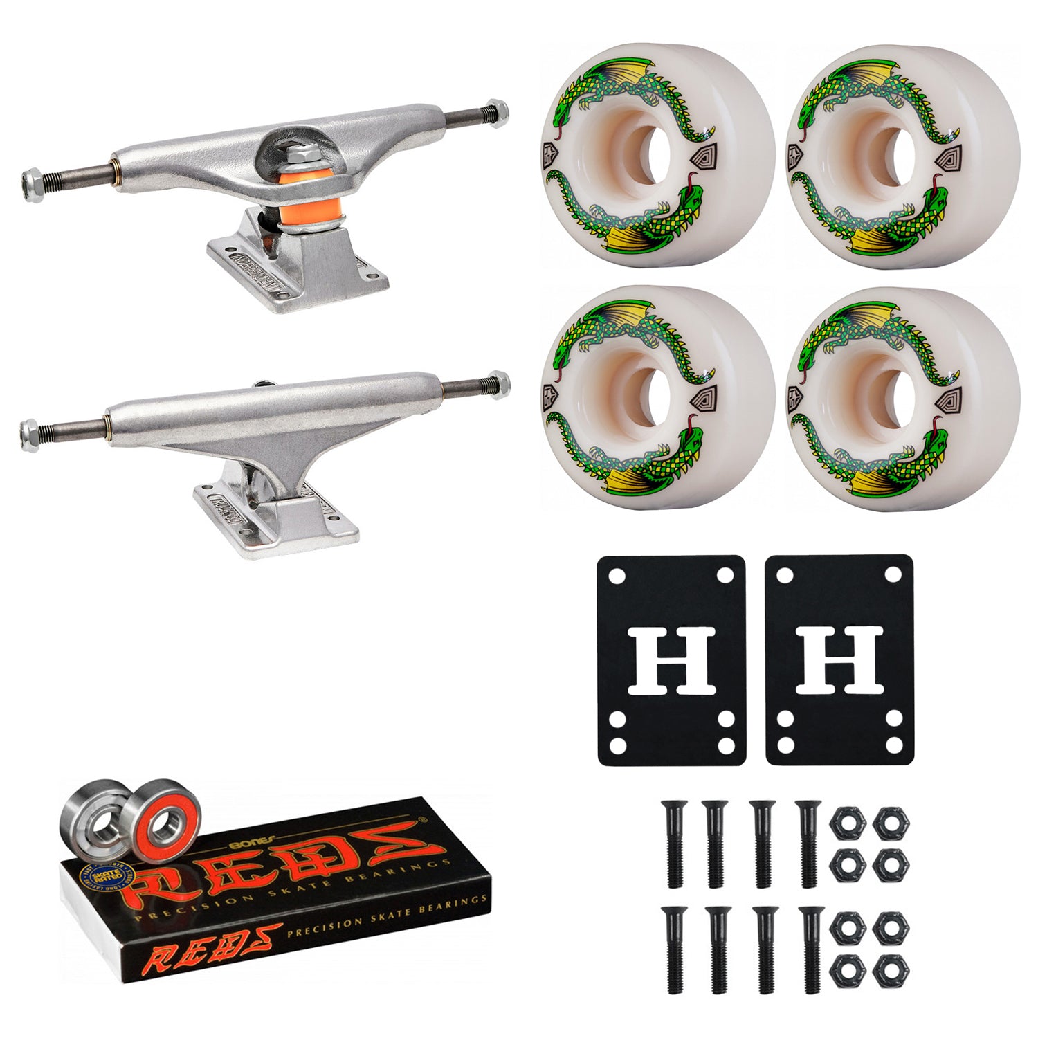 This Independent Trucks Kit features Stage 11 Raw Indy trucks, new Powell Peralta Dragon Formula Wheels, Bones Reds Bearings, 1/8" risers, and 1" black hardware. Independent Stage 11 trucks are durable and high performing for all types of skating. The New Dragon Formula from Powell Peralta features the grip and slide of 99a and 101a wheels, but the durability and softness for all terrain riding. Bones Reds are the best and most popular priced bearing on the market. High quality mixed with low cost make these the go-to bearing for skaters worldwide.