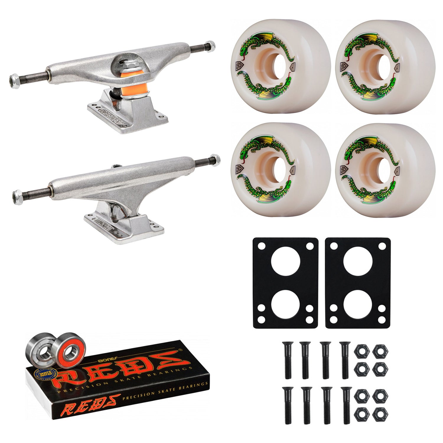 This Independent Trucks Kit features Stage 11 Raw Indy trucks, new Powell Peralta Dragon Formula Wheels, Bones Reds Bearings, 1/4" risers, and 1.25" black hardware. Independent Stage 11 trucks are durable and high performing for all types of skating. The New Dragon Formula from Powell Peralta features the grip and slide of 99a and 101a wheels, but the durability and softness for all terrain riding. Bones Reds are the best and most popular priced bearing on the market. High quality mixed with low cost make these the go-to bearing for skaters worldwide.