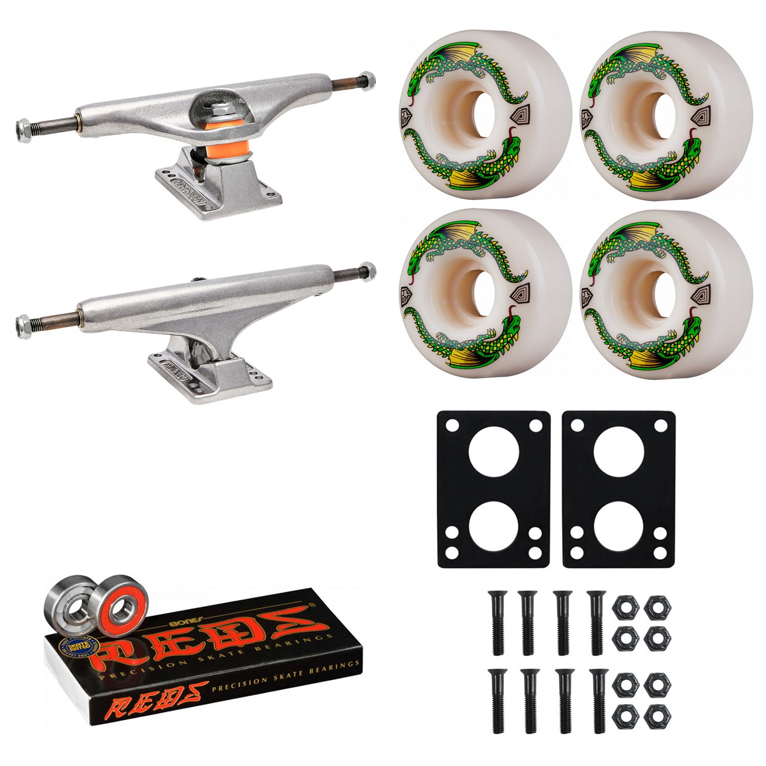 This Independent Trucks Kit features Stage 11 Raw Indy trucks, new Powell Peralta Dragon Formula Wheels, Bones Reds Bearings, 1/4" risers, and 1.25" black hardware. Independent Stage 11 trucks are durable and high performing for all types of skating. The New Dragon Formula from Powell Peralta features the grip and slide of 99a and 101a wheels, but the durability and softness for all terrain riding. Bones Reds are the best and most popular priced bearing on the market. High quality mixed with low cost make these the go-to bearing for skaters worldwide.
