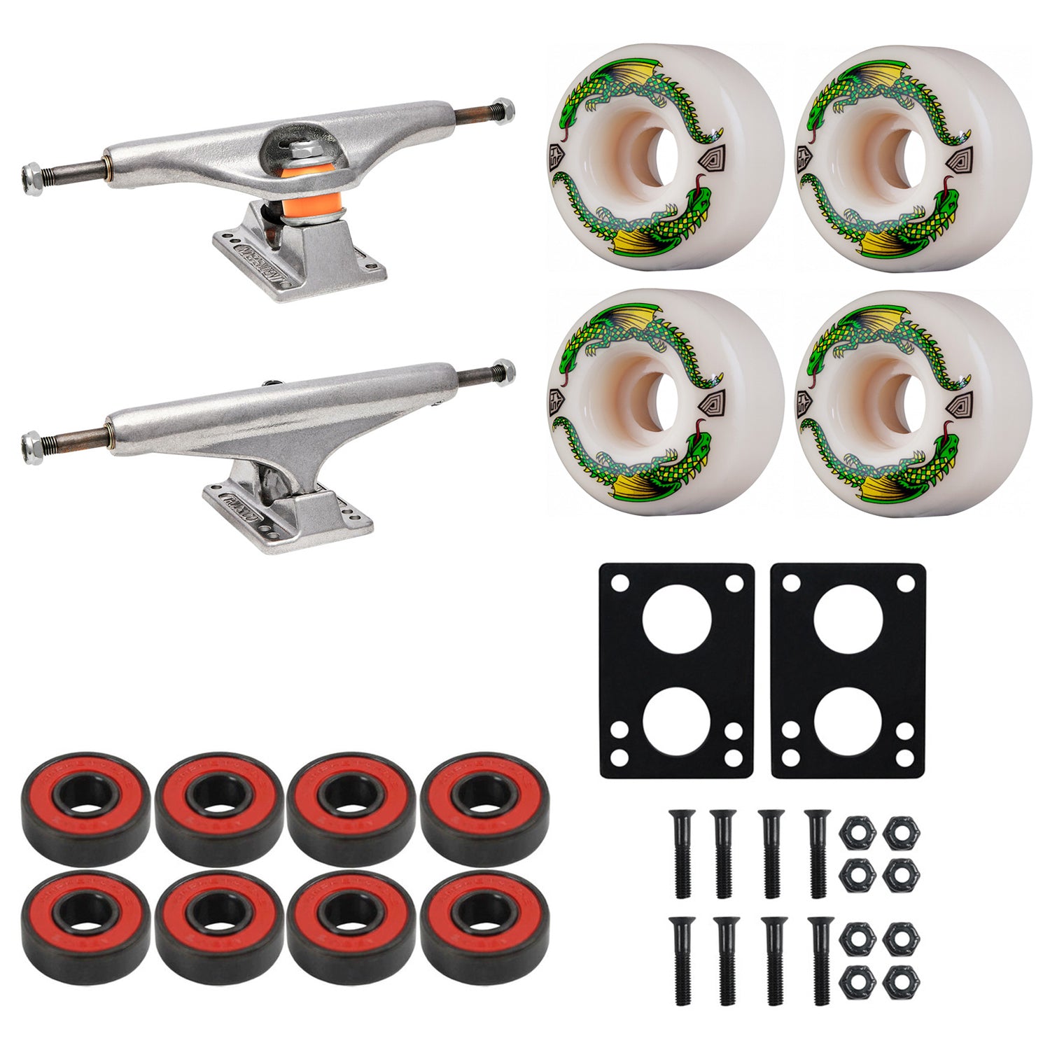 This Independent Trucks Kit features Stage 11 Raw Indy trucks, new Powell Peralta Dragon Formula Wheels, Amp ABEC 5 bearings, 1/4" risers, and 1.25" black hardware. Independent Stage 11 trucks are durable and high performing for all types of skating. The New Dragon Formula from Powell Peralta features the grip and slide of 99a and 101a wheels, but the durability and softness for all terrain riding. Amp bearings are the epitome of durability and speed, high quality abec 5 bearings ensure long life.