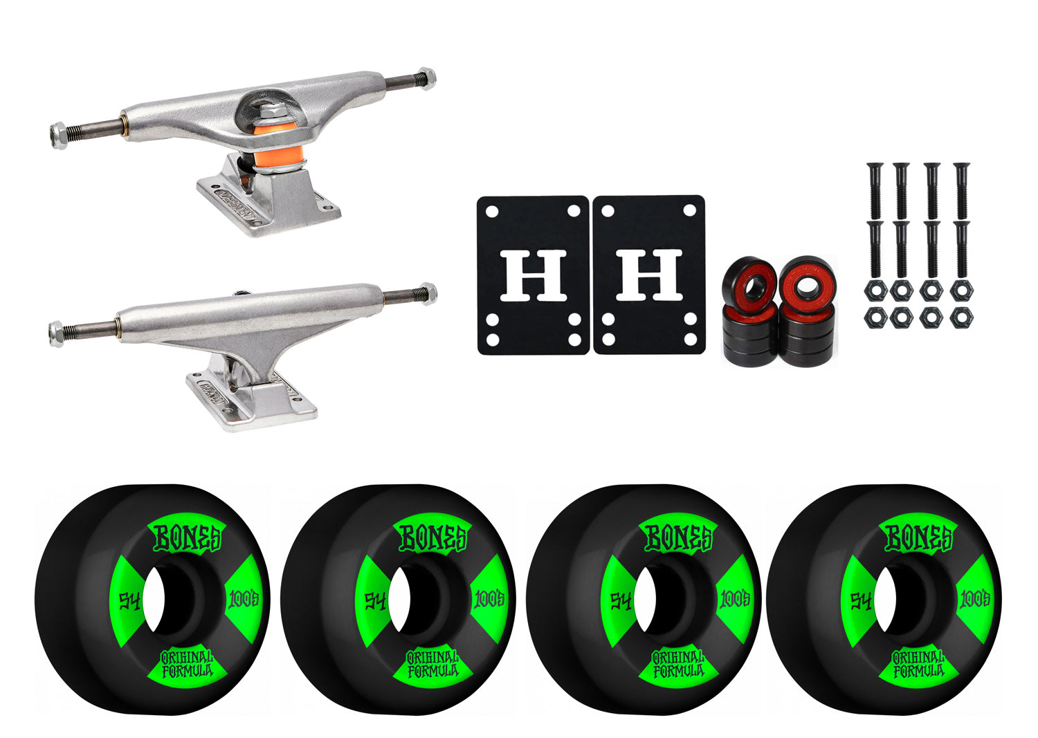 This package contains everything you need to make your deck a complete. Includes a set of Independent Mid Trucks, Bones 100's Wheels, Amp Abec 5 Bearings, 1" Hardware, and 1/8" Riser pads. Just add a deck and griptape and you are ready to ride! Indy trucks are a durable, high performance truck for all types of skateboarding. 356 T6 Aluminum hanger and baseplate, solid Chromoly steel axle, grade 8 kingpin, Indy cushions with cylinder bottom. Featuring superior turn and stability, better grind clearance, improved no hang-up yoke for grind tricks, and less wheel bite. They last longer and are stronger on impact than any other truck on the market. These Bones wheels feature the V5 Sidecut shape, poured with the original 100A formula. These Wheels Measure 54mm x 31mm. Indy 129's Measure 7.6" wide.