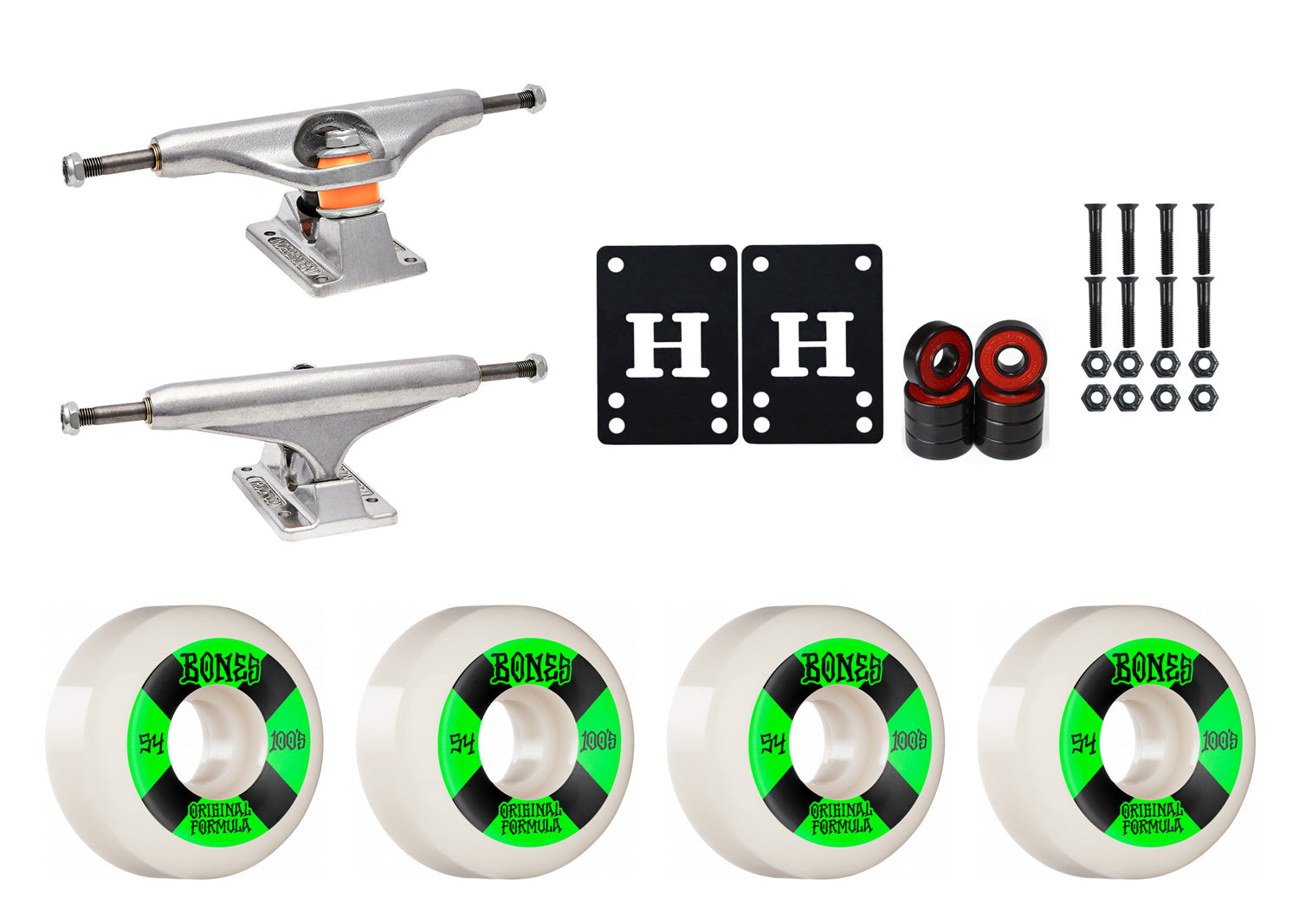 This package contains everything you need to make your deck a complete. Includes a set of Independent Mid Trucks, Bones 100's Wheels, Amp Abec 5 Bearings, 1" Hardware, and 1/8" Riser pads. Just add a deck and griptape and you are ready to ride! Indy trucks are a durable, high performance truck for all types of skateboarding. 356 T6 Aluminum hanger and baseplate, solid Chromoly steel axle, grade 8 kingpin, Indy cushions with cylinder bottom. Featuring superior turn and stability, better grind clearance, improved no hang-up yoke for grind tricks, and less wheel bite. They last longer and are stronger on impact than any other truck on the market. These Bones wheels feature the V5 Sidecut shape, poured with the original 100A formula. These Wheels Measure 54mm x 31mm. Indy 139's Measure 8.0" wide.