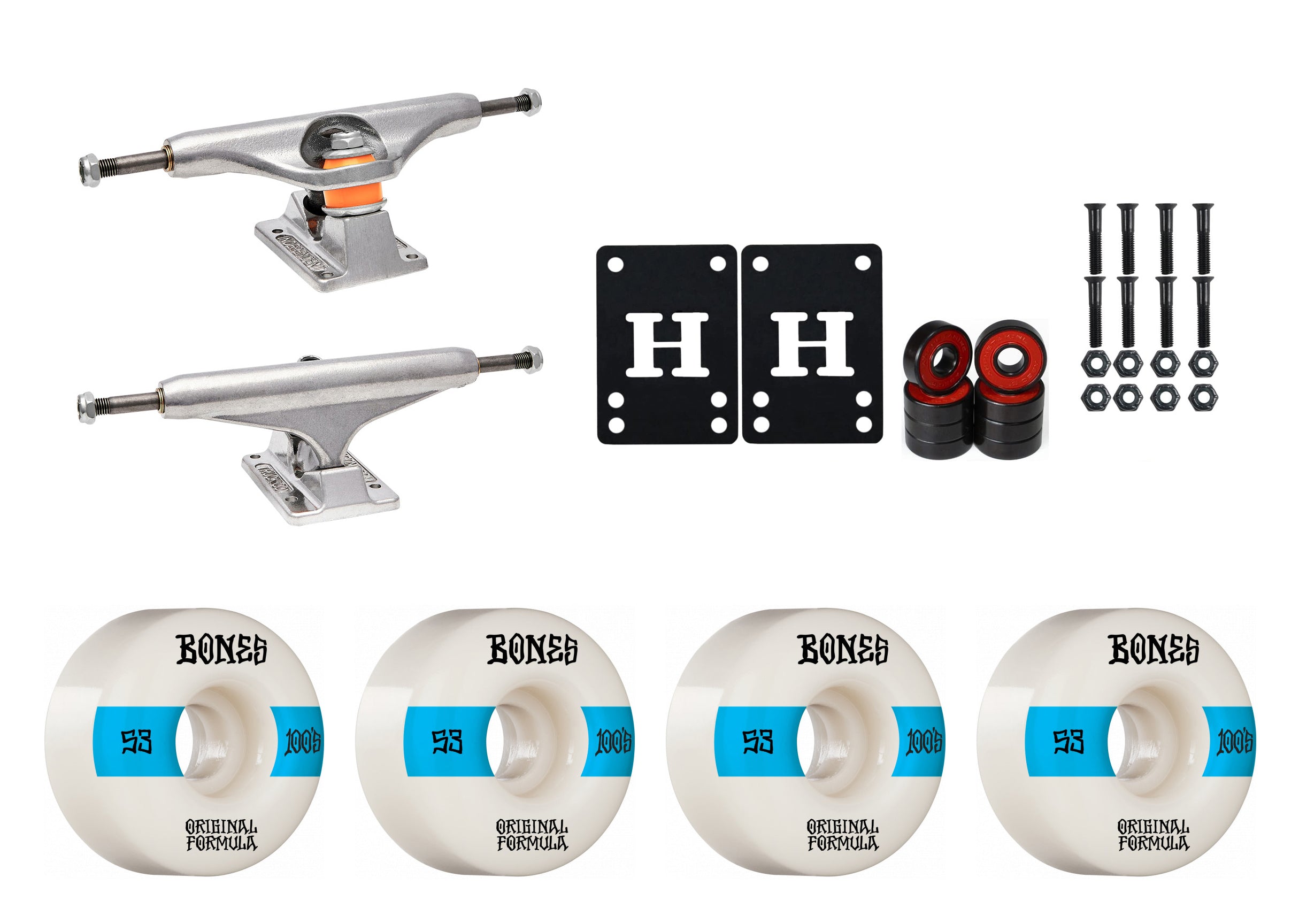 This package contains everything you need to make your deck a complete. Includes a set of Independent Mid Trucks, Bones 100's Wheels, Amp Abec 5 Bearings, 1" Hardware, and 1/8" Riser pads. Just add a deck and griptape and you are ready to ride! Indy trucks are a durable, high performance truck for all types of skateboarding. 356 T6 Aluminum hanger and baseplate, solid Chromoly steel axle, grade 8 kingpin, Indy cushions with cylinder bottom. Featuring superior turn and stability, better grind clearance, improved no hang-up yoke for grind tricks, and less wheel bite. They last longer and are stronger on impact than any other truck on the market. These Bones wheels feature the V4 Wide shape, poured with the original 100A formula. These Wheels Measure 53mm x 34mm. Indy 159's Measure 8.75" wide.